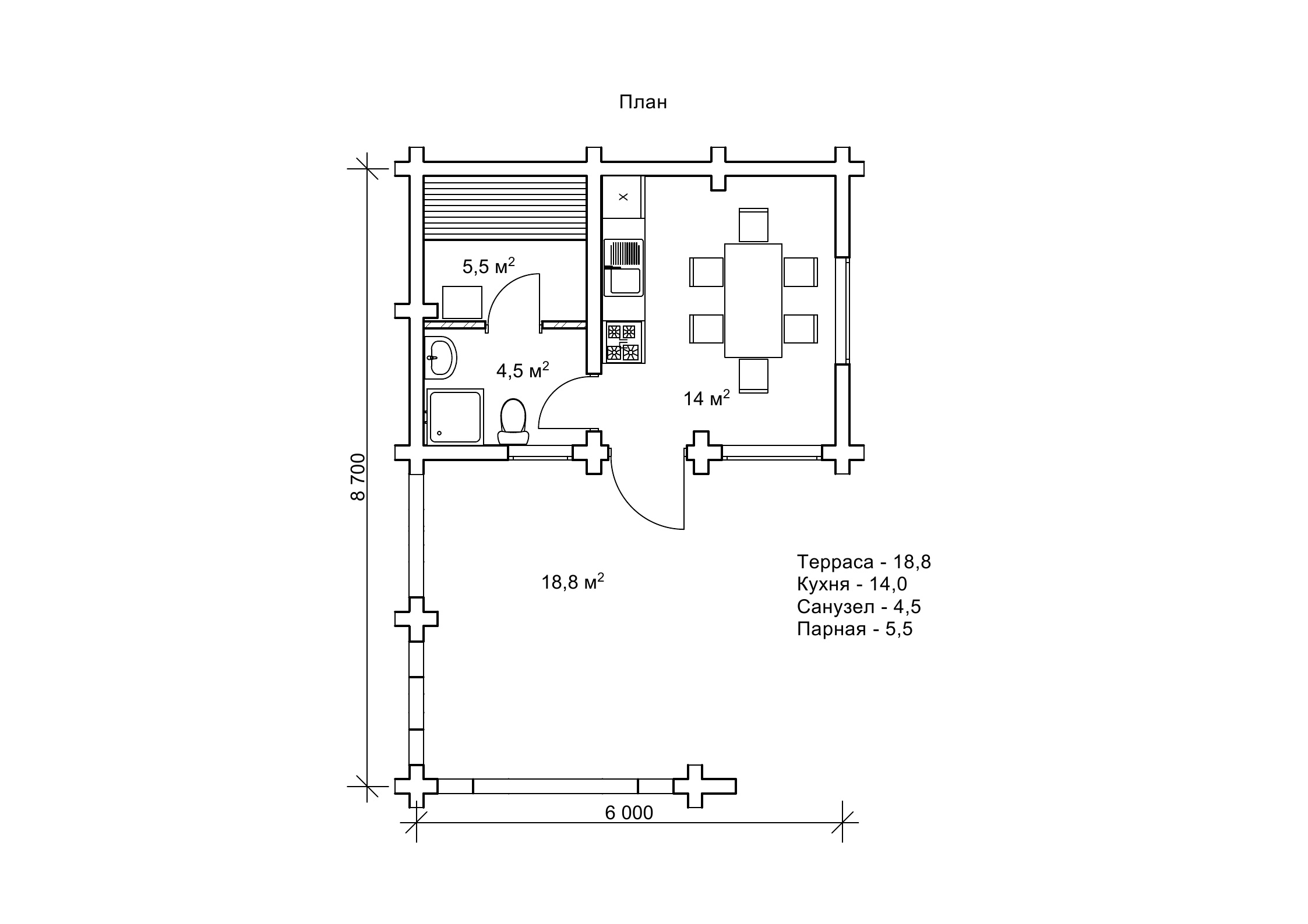 Унікальність проекту лазні «Пані» полягає не тільки в зовнішній оригінальності, але і в зручності планування. Ми вміємо поєднувати всі переваги дерев'яної будівлі під одним дахом. Проект «Пані» площею 42,8 м2 поєднує в собі два функціонально різних приміщення. Баня як би складається з двох частин. Одна частина - це простора альтанка розміром 18,8 м2. Альтанка знаходиться під навісом. Стіни її закриті до середини, що забезпечить максимально приємний, комфортний відпочинок на свіжому повітрі. У такій альтанці можна відпочивати в будь-який час, не тільки після лазні. Тут можна обладнати затишну літню їдальню з гарними, дерев'яними, садовими меблями. Можна відпочити з цікавою книгою, сховавшись від полуденної спеки. Можна організувати в альтанці веселі посиденьки з друзями у вихідні. Місця вистачить на всіх. Друга частина проекту «Пані» - це безпосередньо баня. Це повністю закрита частина площею 24 м2 з великими вікнами і надійними стінами. Баня розділена на три функціональних приміщення: компактна парна розміром 5,5 м2, душова площею 4,5 м2, і простора кухня-їдальня площею 14 м2. Внутрішнє планування лазні продумане так, щоб тут було максимально комфортно. У компактній парній поміститься сім'я або невелика компанія друзів. Простора кухня призначена для відпочинку після парної. Тут ви зможете відновити свої сили, випити запашного трав'яного чаю і поспілкуватися з друзями. При бажанні тут можна приготувати і смачний обід. У теплу пору року після парної можна відпочивати на терасі (альтанці). Проект «Пані» придуманий для створення затишку на прибудинковій території. Ви зможете чудово провести час на свіжому повітрі і оздоровитися в лазні. І для цього вам не потрібно нікуди їхати, достатньо вийти на подвір'я. Параметри 6 на 8,7 м2 дозволяють без утруднень побудувати проект у дворі основного житла.