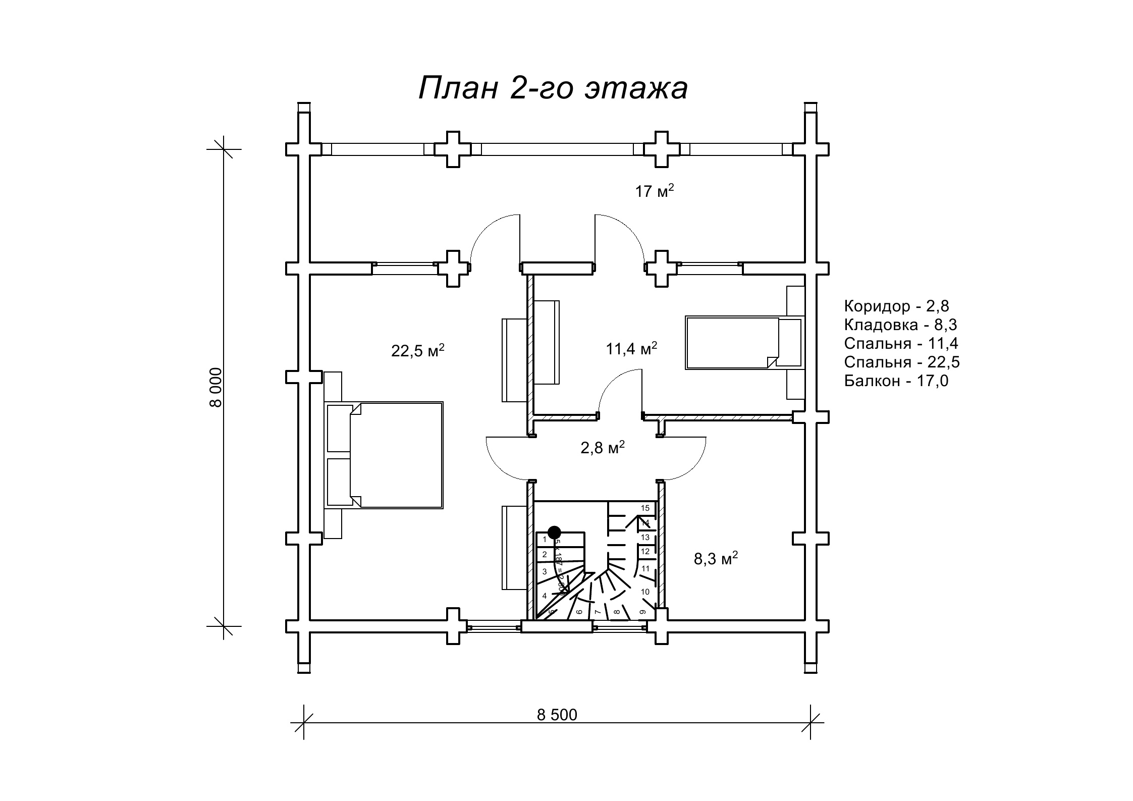 Вибір оциліндрованих колод для будівництва ми обговорили, тепер можна поговорити про розмір колод. Діаметра Ø 180 мм абсолютно достатньо для сезонного котеджу, в якому родина збирається проводити деякий час, або навіть проживати влітку під час відпустки. Так як це буде не цілорічне житло, то не варто здорожувати будівництво, вибираючи колоду більшого діаметру, наприклад з діаметром 200-220 мм. У питаннях бюджету споруди, господар вибрав максимально простий дизайн без косих чаш і повноцінного другого поверху (як бачимо, в проекті «Мадог» спроектована мансарда) .Тобто можна сказати, що проект «Мадог» відрізняється оптимальним співвідношенням ціна / якість і являє собою цілий набір переваг, якщо розглянути його внутрішнє планування детально, чим зараз і займемося.