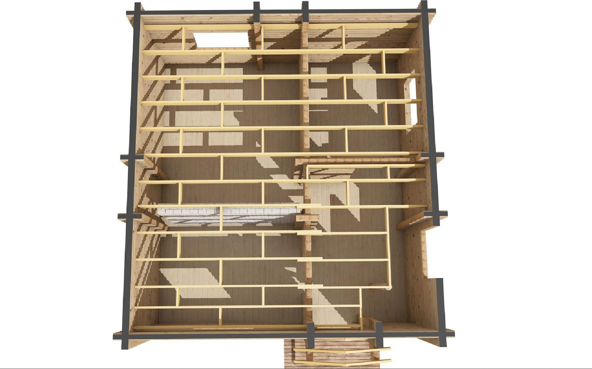 Параметри споруди склали 7,1 на 7,8 м по осях стіни. І в цих габаритах кожен куточок має сенс. Наприклад, зверніть увагу на цегляну стіну посеред споруди. За запитом клієнта ми мали обіграти цю стіну, що лишилась від старого, цегляного будинку під місце для каміну в новому котеджі. На плануванні і фото з локації будівництва гарно видно, як стіна вписалась в загальний конструктив і стала однією зі стін у вітальні. Будівля має максимально просту, квадратну форму, класичний прямокутний силует із високим двосхилим дахом, який поки ще в процесі зведення. Стіни з оциліндрованих колод сповнені ароматами смоли й тепла лісу. Каркас крокв уже на місці, готовий прийняти покрівельний матеріал. Велике віконце на другому поверсі - це не просто отвір у стіні, а майбутній джерело світла, що заливатиме інтер’єр мансарди сонячним сяйвом.