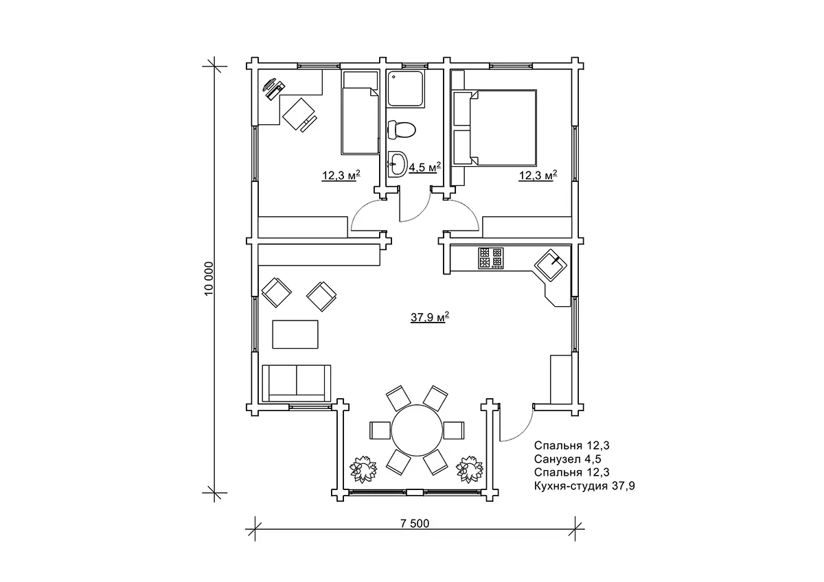 Для круглорічного проживання рекомендується обирати товщину брусу 200 мм. Так і зробив наш замовник, якому ми будували проєкт «Айрінвін» в с.Келеберда (Полтавська область). Він обрав товщину висушеного, суцільного, профільованого брусу 200*150 мм, і тепер проживатиме в будиночку в своє задоволення круглорічно. З такою товщиною стін оселя буде теплою, і навіть панорамні вікна не стануть суттєвими містками холоду. Вікна, що займають увесь головний фасад одразу притягують погляд і додають йому вишуканий вигляд, а незвичайна форма будівлі з високими вікнами створює відчуття простору та «другого світла». Хоча насправді це компактний одноповерховий котедж з параметрами забудови 10×7,5 м.