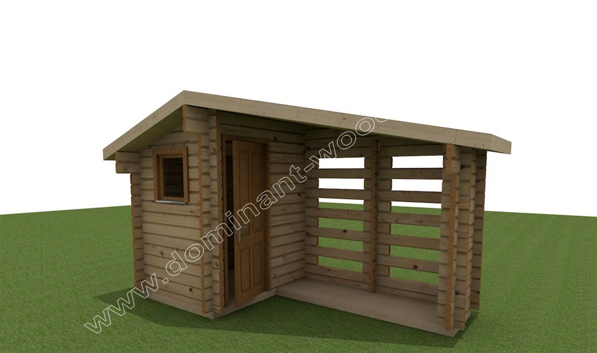 Цей проект якнайкраще відноситься до будівель з дерева для зручного й гарного облаштування прибудинкової території. Господарський будиночок спланований в розмірах 2,7 на 4,8 м2, в ньому є мініатюрні віконця й одні двері. У проекті передбачений односхилий дах. Всі архітектурні рішення з будівництва цього хозбудиночка спрямовані на економію бюджету, адже не доцільно здорожувати господарське, нежитлове приміщення.