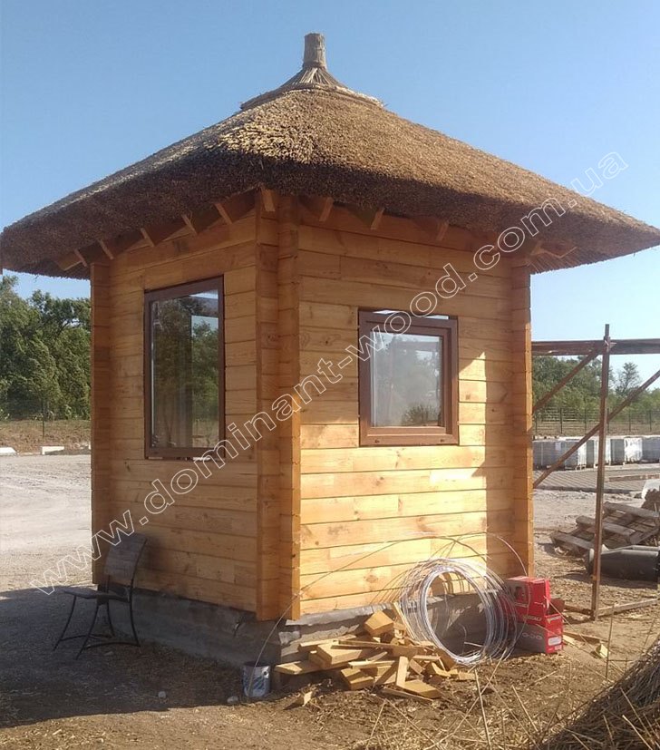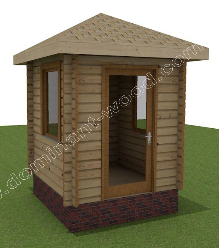 Для великих приватних територій під охороною, готельних комплексів, стоянок автомобілів відмінно підійде сторожка з дерева. Це мініатюрне, легке спорудження 2*2 м, з великими вікнами для хорошого огляду. Сторожка може виконуватися з мінімального по товщині дерев'яного бруска 60*150 мм. Але якщо ви плануєте експлуатувати приміщення охоронного пункту всесезонно, і охоронець повинен буде присутній на посаді цілодобово, і взимку в тому числі, то вибирайте все ж брус тепліше, наприклад, 150*150 мм або 200*150 мм.