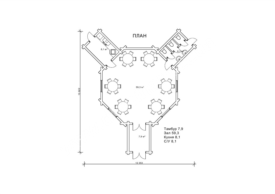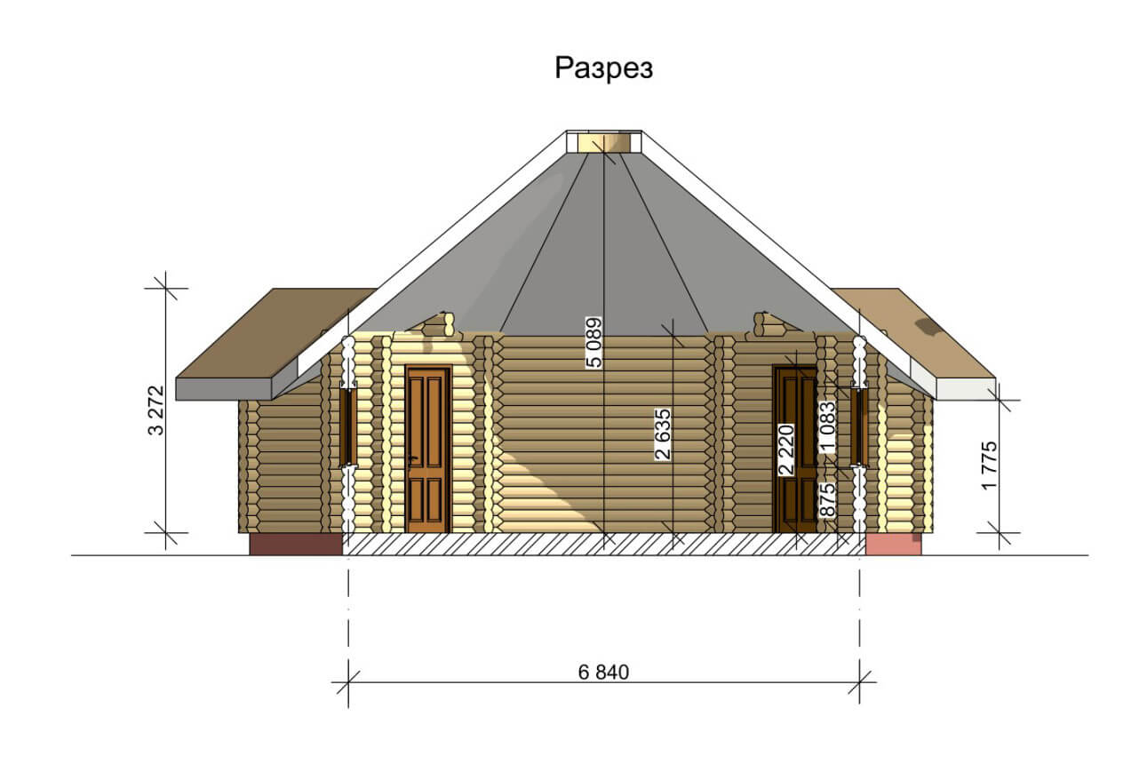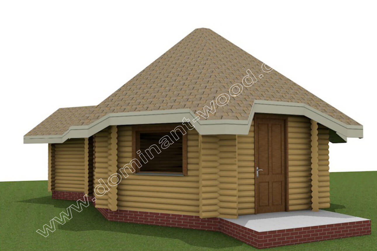 Найяскравіша риса проекту - форма споруди, яка представляє собою восьмикутник, викладений з оциліндрованих колод. Архітектуру будови можна порівняти з сонцем, від якого йдуть промені. До центрального залу кафе примикають приміщення кухні і санвузлів, а також передпокою на 7,9 м2, який зручно служить тепловим тамбуром і гардеробом, де можна залишити верхній одяг.