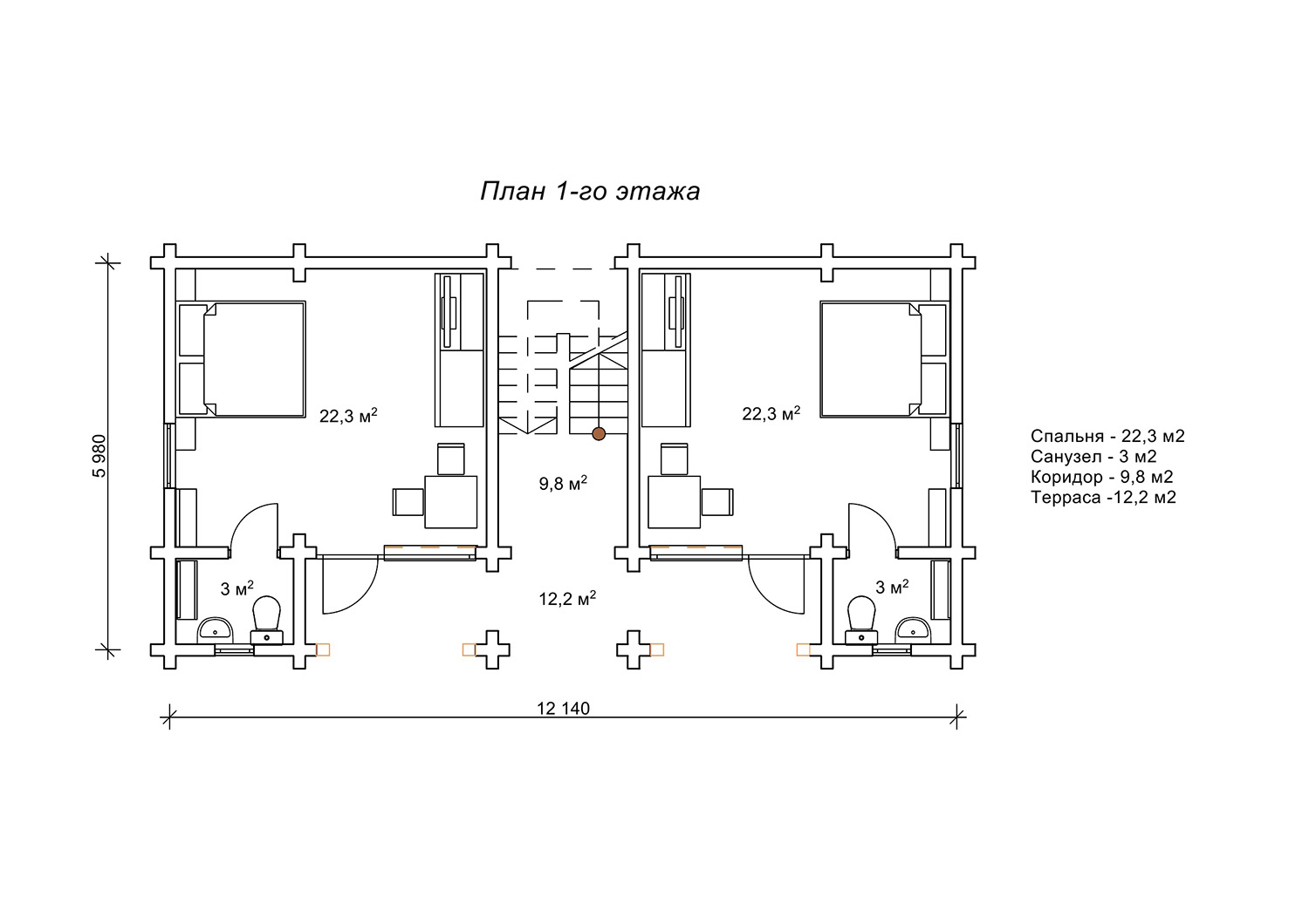 Такий варіант відмінно підійде для тих, хто бажає відкрити готель де-небудь в надзвичайно миловидному місці. Чому саме цей проект? Планування двох поверхів є практично ідентичним. В готелі буде 4 номери з ванною, площа кожного з яких 22,3 м2. Кімнати готелю не мають загальних стін, що дуже зручно і обов'язково сподобається вашим клієнтам, адже мешканці сусідніх номерів не будуть ніяким чином заважати один одному. У кожному номері є балкон. Там гості можуть спостерігати навколишню красу, насолоджуватися приємним проведенням часу або влаштовувати собі сніданки і вечері на свіжому повітрі. Така споруда розрахована на те, що вона буде частиною великого комплексу. Будиночки будуть розміщуватися на одній території поруч з іншими будівлями: кухнею, рестораном і спорудами, в яких передбачатимуться місця для відпочинку. Таке планування вважається дуже зручним для гористих місцевостей та інших територій, де не можна побудувати одну велику будівлю, в якій можна облаштувати всі необхідні приміщення.