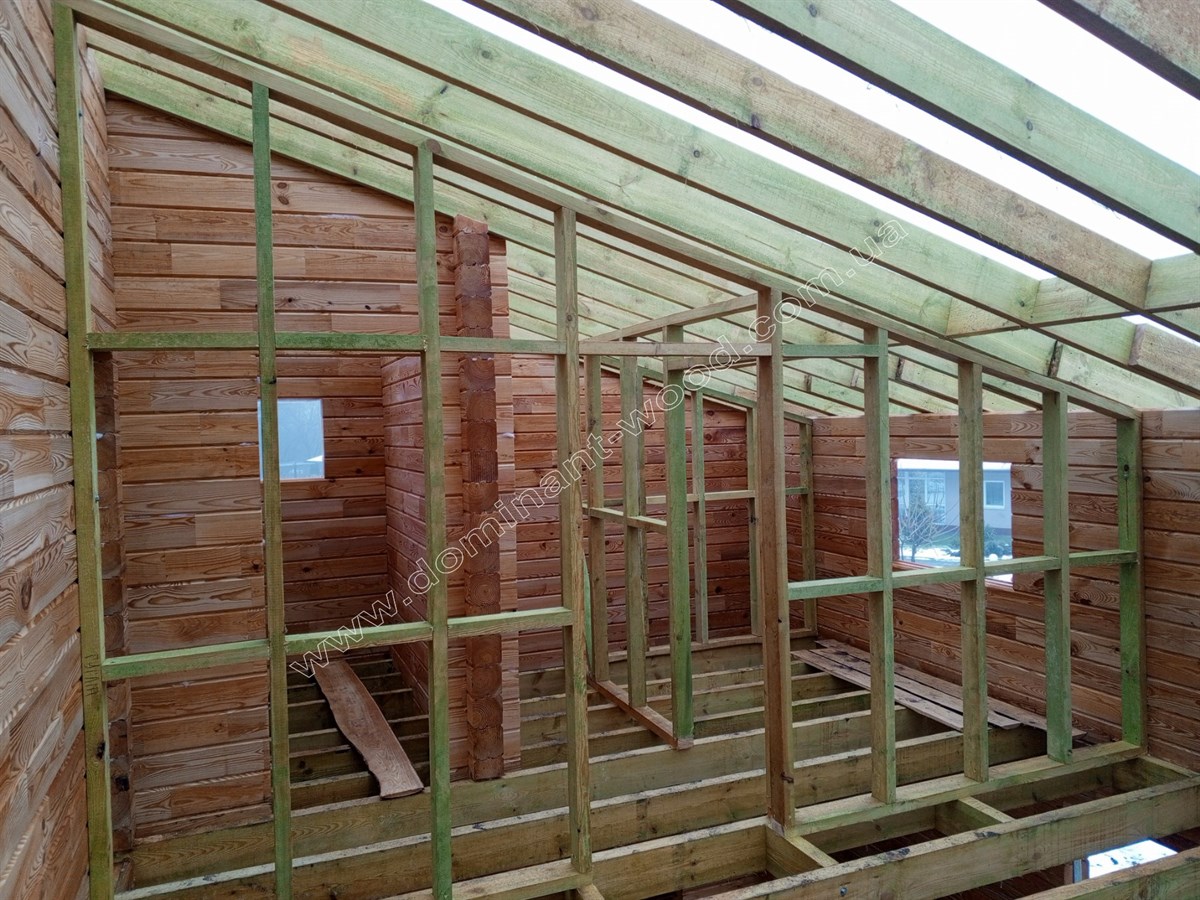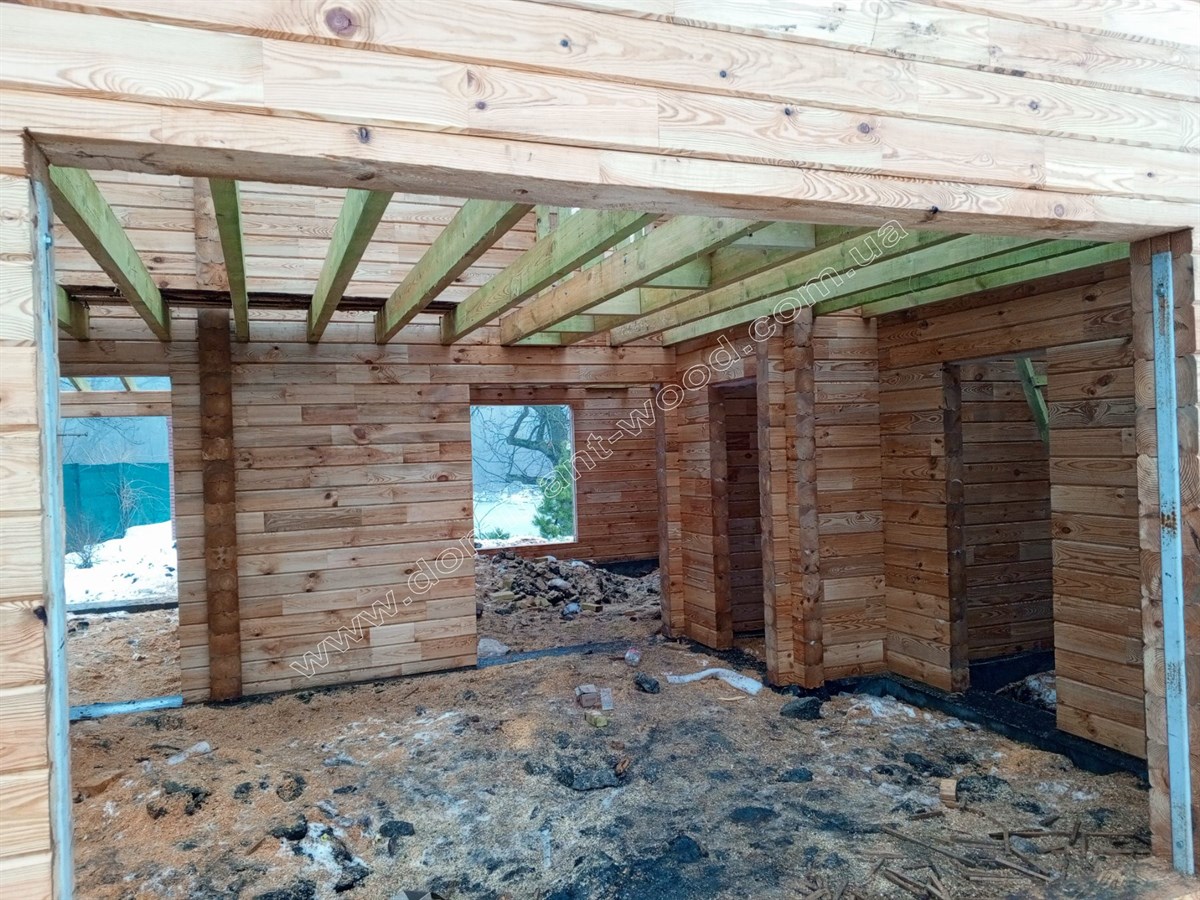 На цей раз замовник зупинив свій вибір на просушеному, суцільному брусі. Товщина брусів по периметру будинку складає 200*150 мм, а внутрішніх перегородок 150*150 мм. Однією з конструктивних особливостей будинків з профільованого, висушеного бруса є можливість поєднувати між собою стіни з різних розмірів брусів. Багато хто робить максимальну товщину зовнішніх стін і трохи менший розмір внутрішніх перестінків. Це відчутно економить бюджет споруди ніяк не впливаючи на внутрішню шумо- і теплоізоляцію.