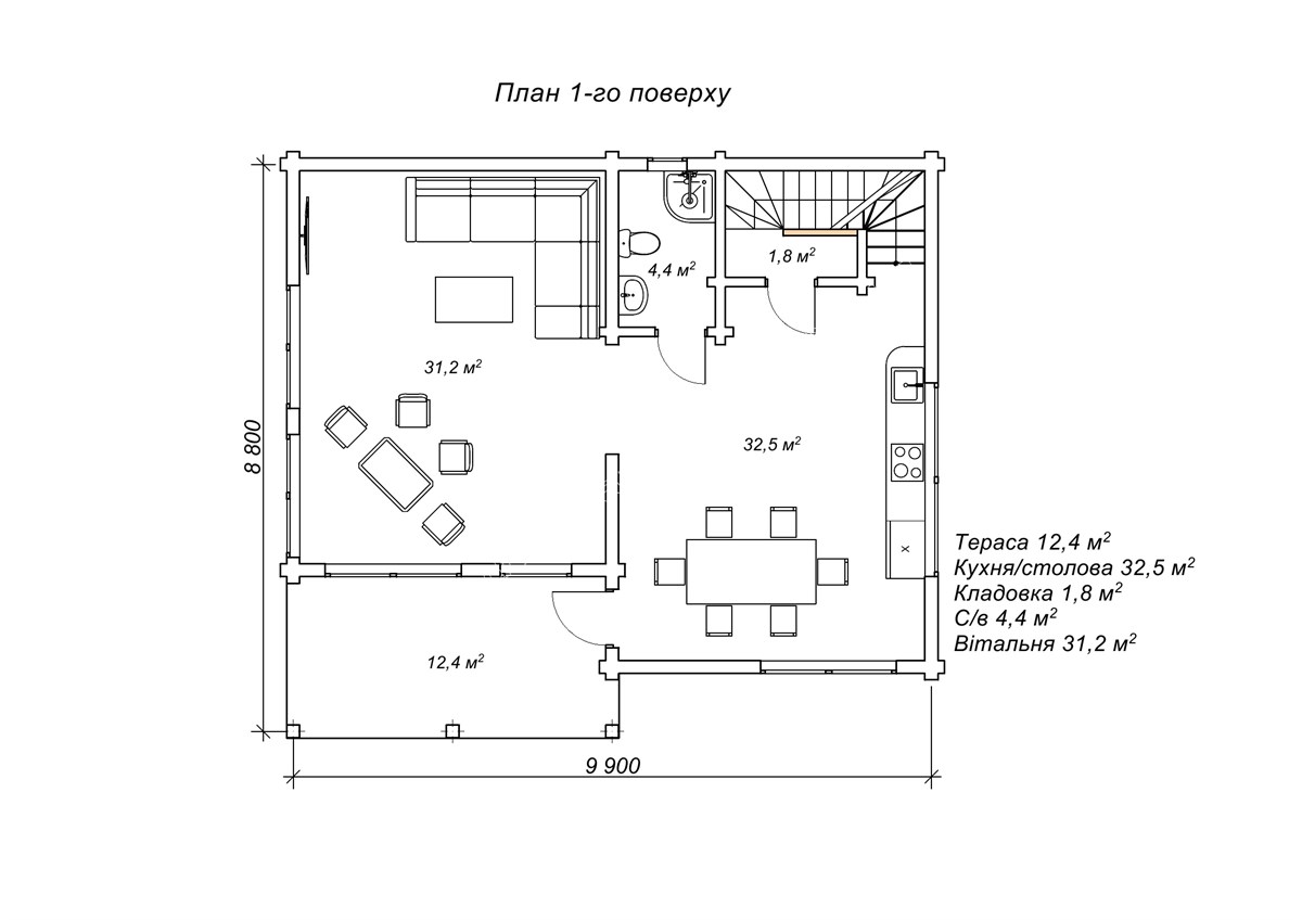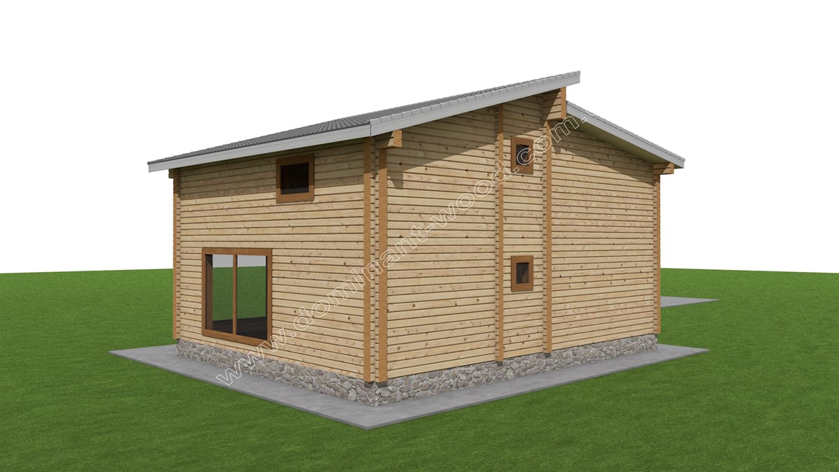 Перший поверх маєтку включає терасу, вітальню і кухню-студію, а також санвузол та сходи. Досить вільне зонування першого поверху та мінімум перегородок забезпечує можливості швидких змін у планування простору за власним настроєм. Тут можна пересувати меблі, обідню зону або м’який куточок, в залежності від того, який краєвид ви сьогодні бажаєте спостерігати у панорамні вікна. На другому поверсі розташовано коридор, санвузол і дві спальні, одна з яких містить просторий гардероб. Сучасний маєток з дерева, прикрашений великими вікнами, оснащений двома спальнями, став ідеальною заміською оселею для нашого замовника, де втілюються усі його уявлення щодо внутрішнього комфорту та зовнішньої естетики.