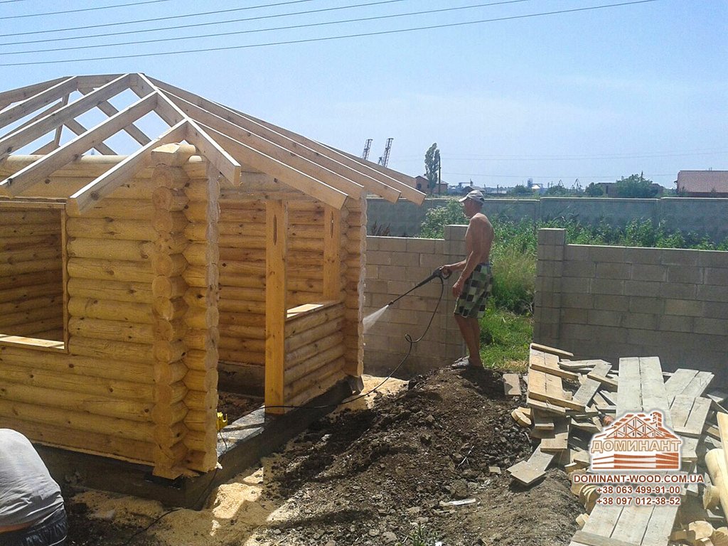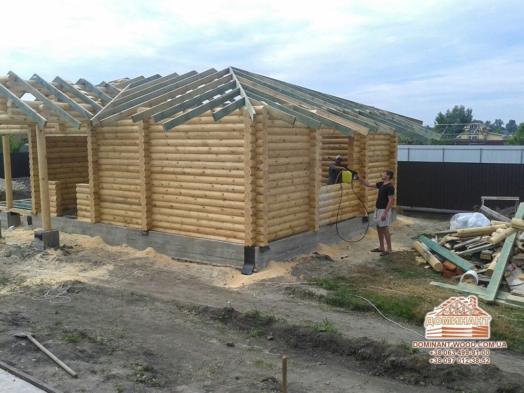 На початковому етапі виробництва будинку з оцилиндрованного бруса колоди, балки і крокви обробляються антисептиком методом, докладно наведеним в статті «Обробка бруса антисептиком».