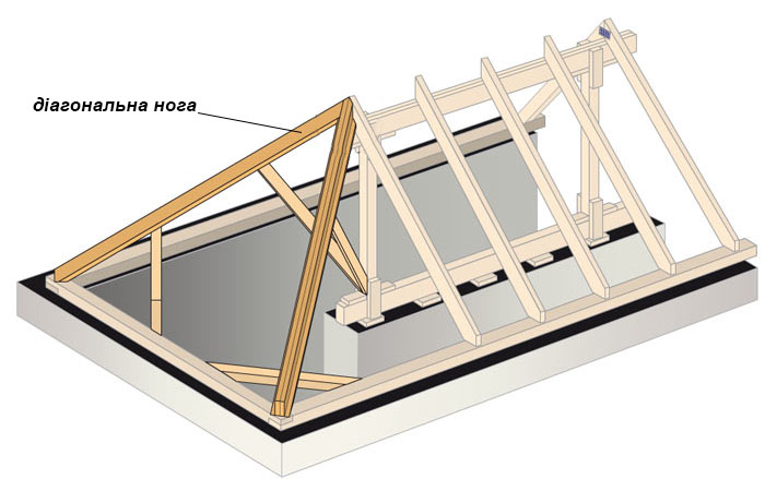 Діагональна кроква – це балка, яка спирається на кут будівлі в кроквяній системі чотирьохскатного даху.
