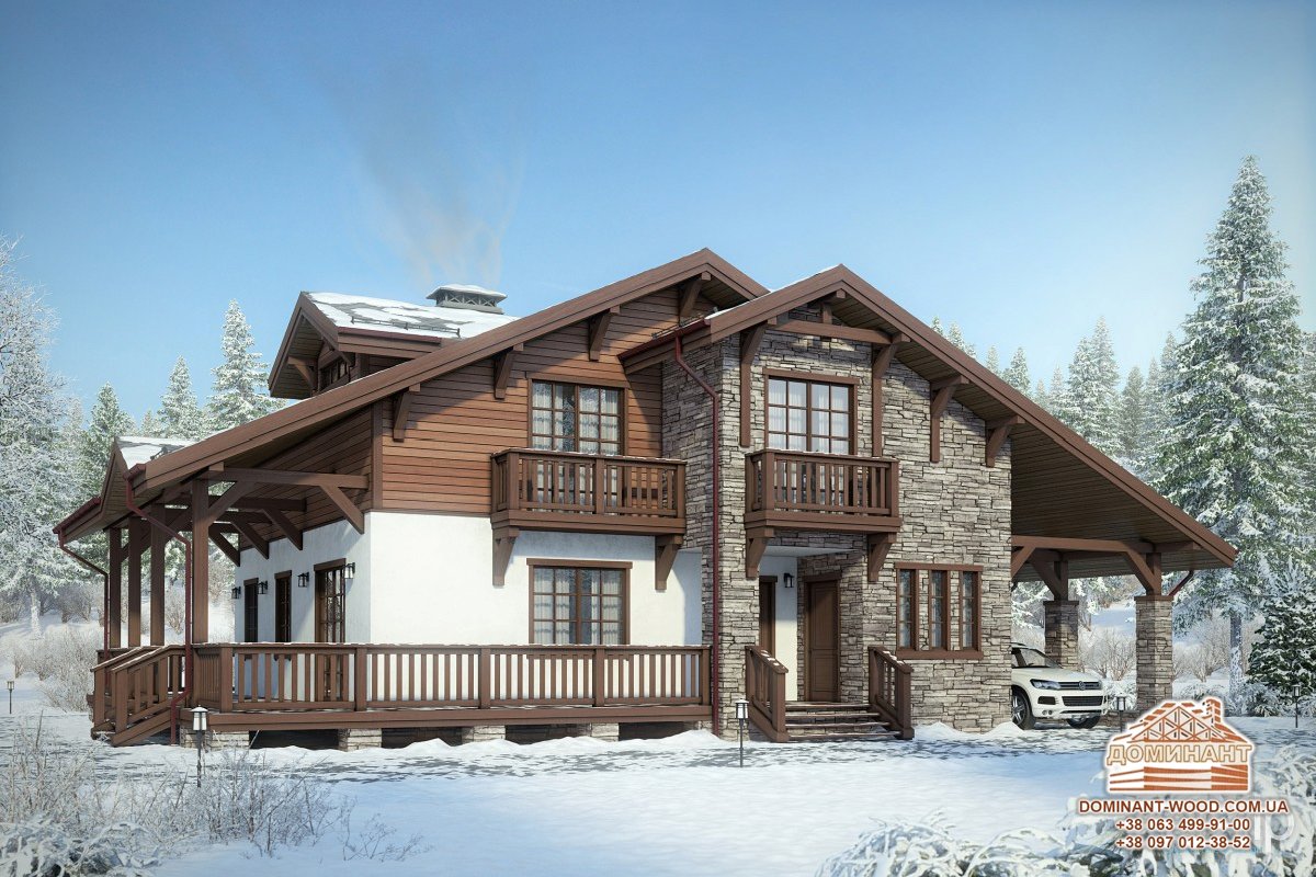 - виключно природні матеріали спорудження будинку: дерево, або комбінація дерева з каменем. Дивіться приклад готового проекту «Аметист» в стилі шале від компанії «Домінант».