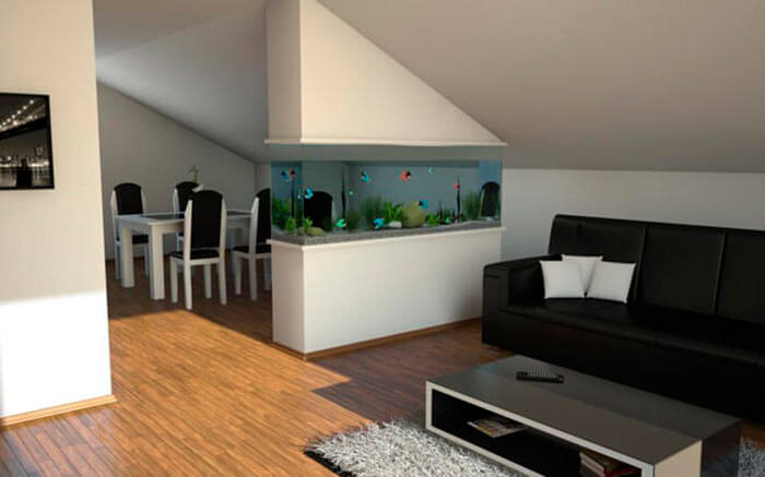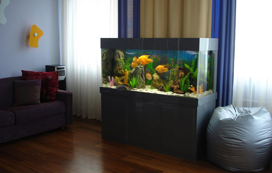 Погодьтеся, що інтеграція акваріума повністю перетворює будь-яку кімнату і змінює її сприйняття. Найвдаліше рішення - поставити акваріум на тумбу, особливо пересувну, або на підлогу. Такий спосіб установки акваріума відрізняється мобільністю і легкістю обслуговування.