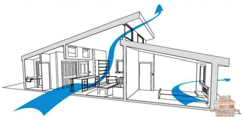 Зазвичай вона відбувається за рахунок природного спонукання руху повітря, який проникає через пази, а виходить за допомогою пасивних вентиляційних систем. У енергоефективних будинках замість вікон можуть використовуватися звукоізолюючі склопакети, а вентиляція здійснюється через установку рекуперації тепла.