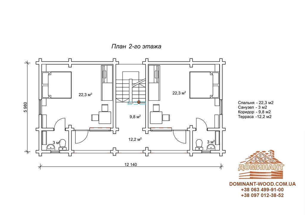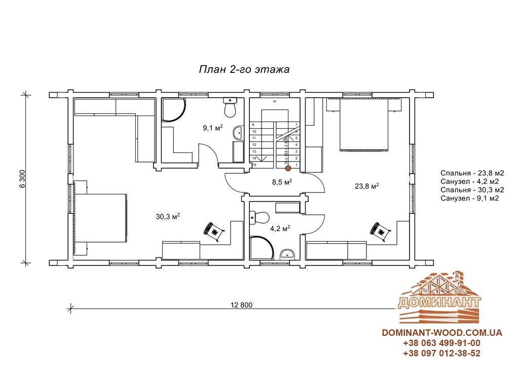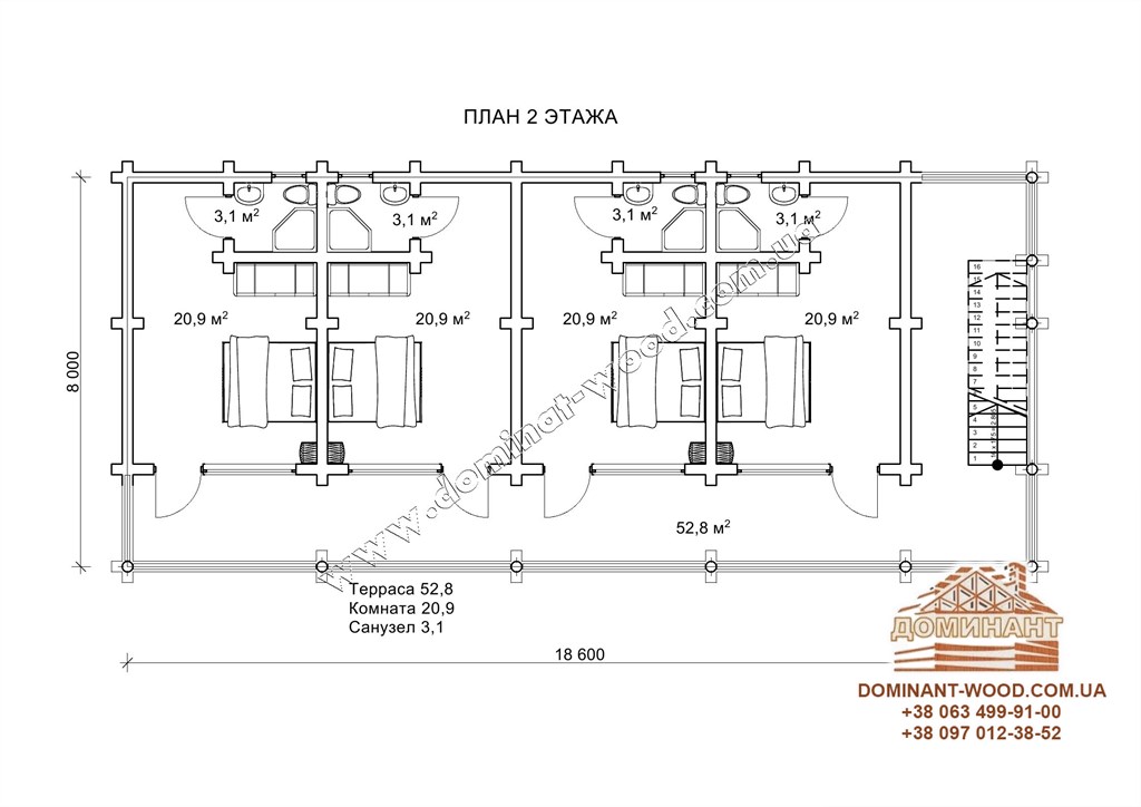 Цей проект хороший з усіх сторін, як не глянь. Включає в себе 8 номерів з індивідуальними санвузлами. Його симетрична грація і біле мереживо зрубу більш імпонують лісовим пейзажам. Сходи, в даному випадку, виступають як окремий елемент декору і тераса доповнює загальний вигляд. Ця будова створена бути базою відпочинку і в комплекті з невеликим рестораном буде чудовим комплексом для відпочиваючих, де можна не тільки відпочити, а й смачно перекусити. Перевага проекту «Гостєдар» в тому, що за площею займаної території він дуже компактний і при цьому досить місткий.
