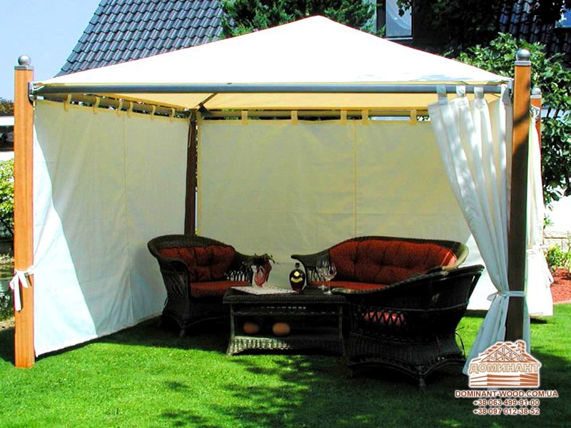 Для декорування відкритих альтанок використовують легку тканину з бавовни або синтетики. Натуральна тканина швидше вицвітає і старіє, її важко відіпрати. Але вона краще підійде, якщо ви вирішили оформити альтанку в етнічному стилі. Прикрашаючи альтанку тканиною, можна досягти приголомшливих ефектів.