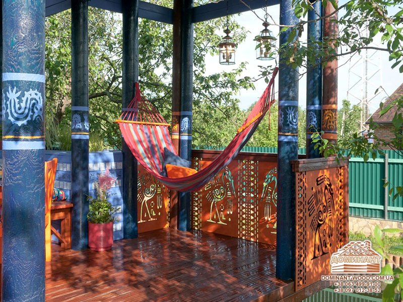 Розпис та різьблення, прикраса кольоровими вітражами допоможе створити різні малюнки і композиції, що зробить вашу альтанку унікальною.