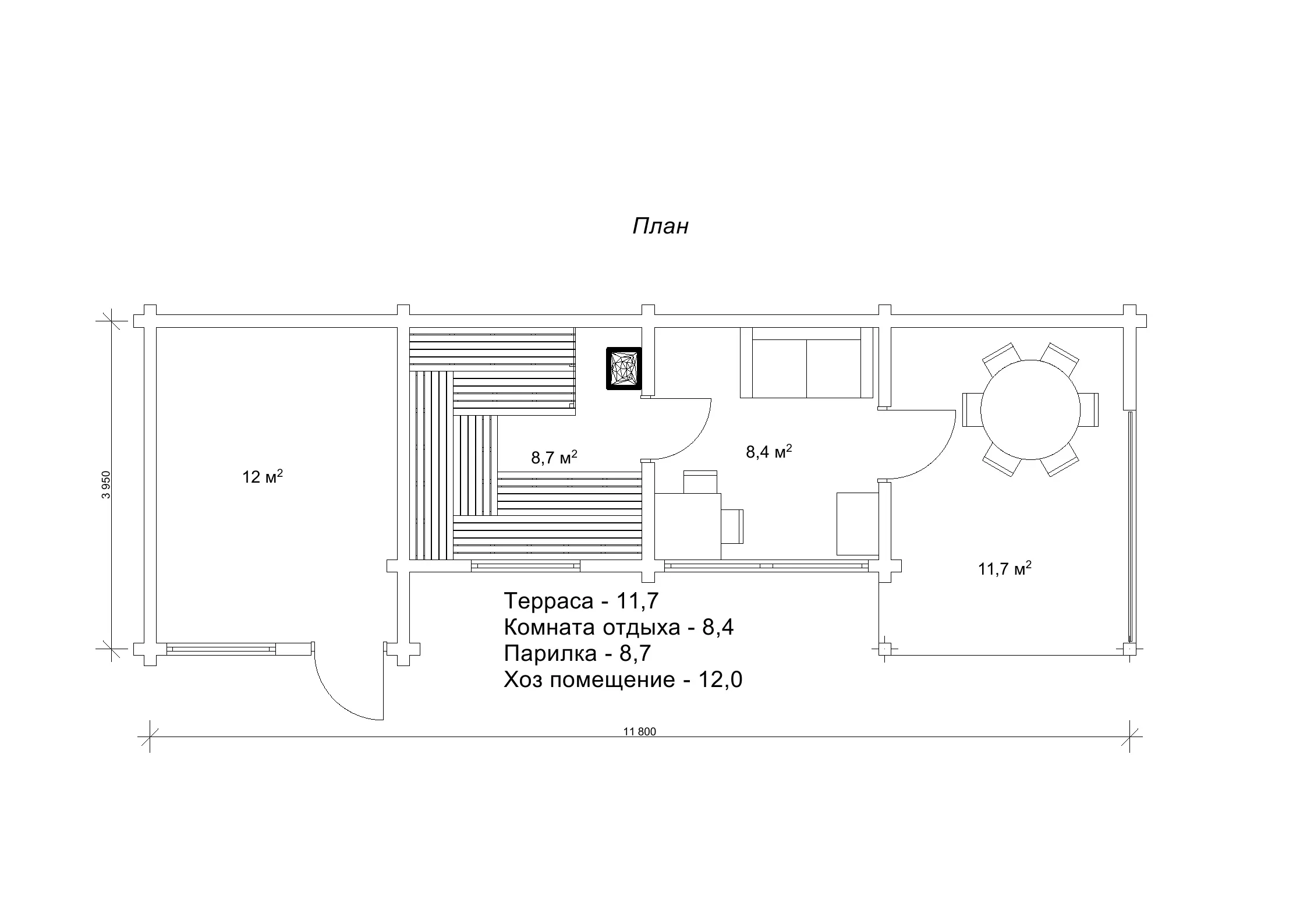 Прямі лінії, мінімалізм, плоский дах і велике панорамне вікно - усе тут створено для тих, хто цінує сучасну естетику та комфорт. Розміри будівлі - 3,9×11,8 м, загальна площа - 40,8 м². Всередині - простора парилка площею 8,7 м², яка легко вмістить понад десять осіб. Поруч з парилкою затишна кімната відпочинку, а далі вихід на відкриту терасу, де можна насолоджуватися свіжим повітрям після гарячих процедур. Цікава деталь проекту - відсутність санвузла та душової. Це було рішення замовника, але за бажанням їх легко можна додати. А ось що дійсно вирізняє «Арісу», так це окреме господарське приміщення площею 12 м². Тут можна облаштувати сарай, літню кухню або навіть міні-майстерню - повна свобода вибору! Таким чином, в одній компактній будівлі ви отримуєте одразу три функції: лазню, зону відпочинку та господарське приміщення. Зручно, стильно і продумано до дрібниць.