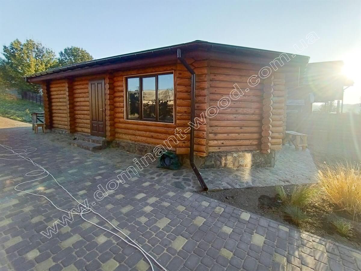 Особливий акцент індивідуального проекту лазні - простора засклена тераса у восьмигранному приміщенні. Тут можна повністю розслабитися після гарячої фінської сауни, не виходячи за межі дерев’яного будиночка. Уявіть: тепло після парної, свіже повітря, спокійний вид на природу. А ще тут можна розмістити чан або навіть невеликий басейн, що підніме якість відпочинку в лазні на вищий рівень і додасть популярності закладу.