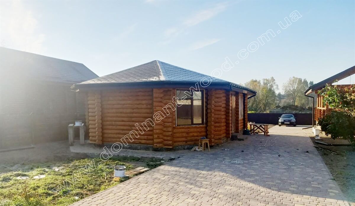 Якщо класичні лазні здаються вам надто звичними, зверніть увагу на проект «Фіолла». Це компактний, але вишуканий восьмигранний дерев’яний будиночок, який виглядає немов із казки. Овальна форма, симетрично розташовані вікна - усе це створює легку, затишну атмосферу.