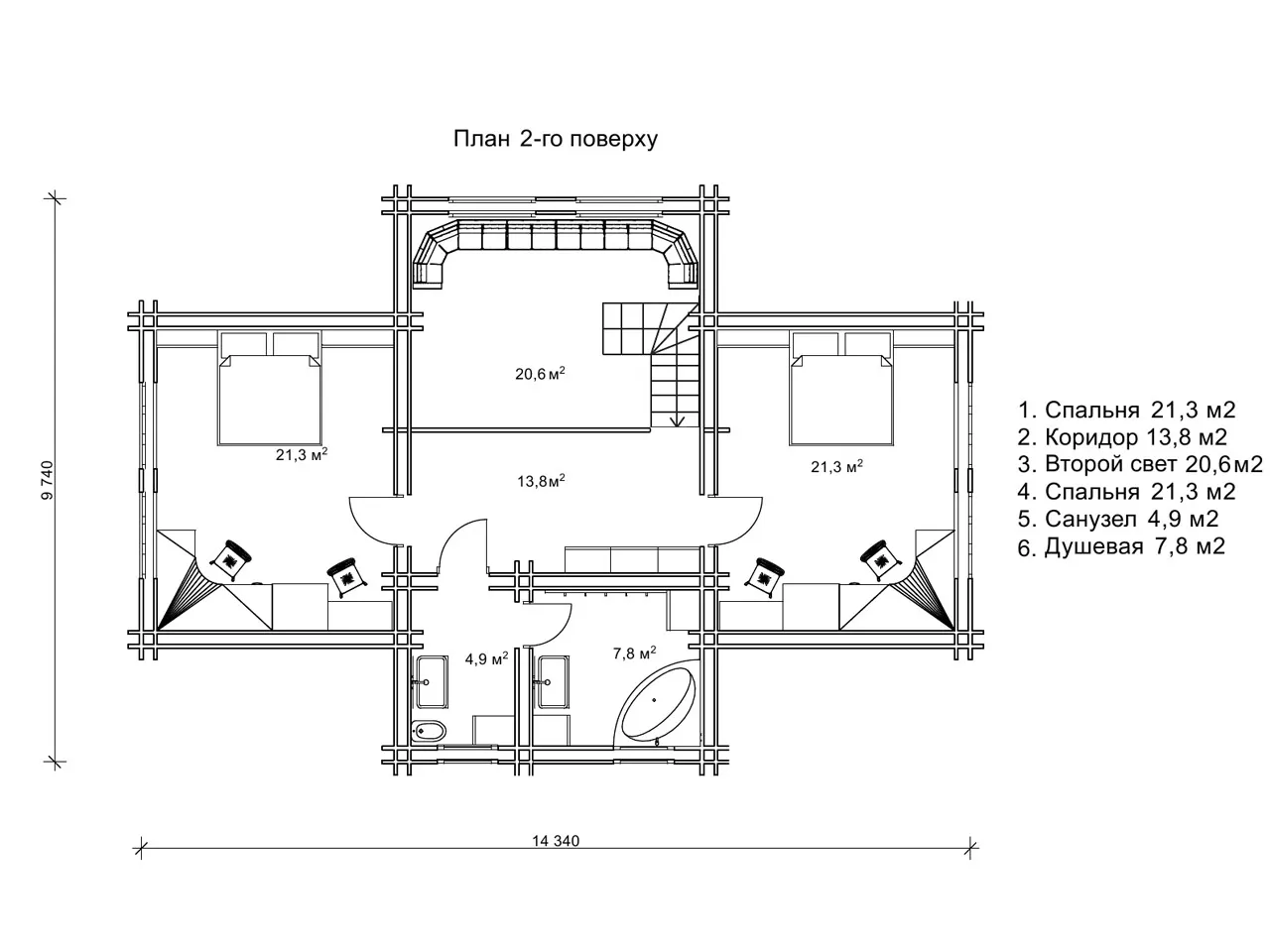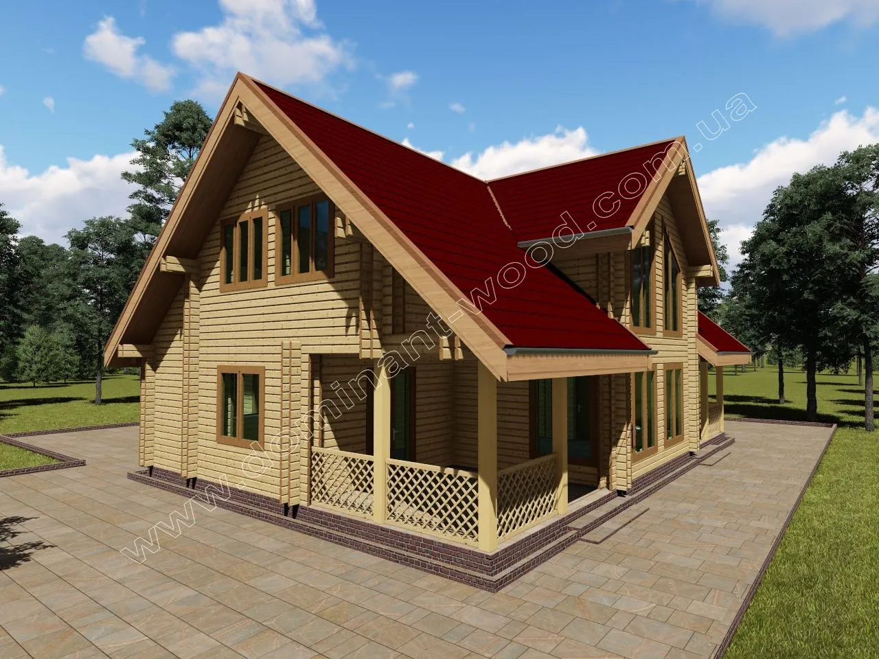 Другий поверх відкривається з видової площадки другого світла, з якої є вихід у дві спальні, ванну кімнату та санвузол. Планування гармонійно поєднує простір для відпочинку, роботи й прийому гостей. Маєток вражає не тільки архітектурою, але й функціональністю. Він створений для тих, хто мріє про щоденний комфорт, здоровий відпочинок біля власного басейну й довговічність дерев’яного житла.