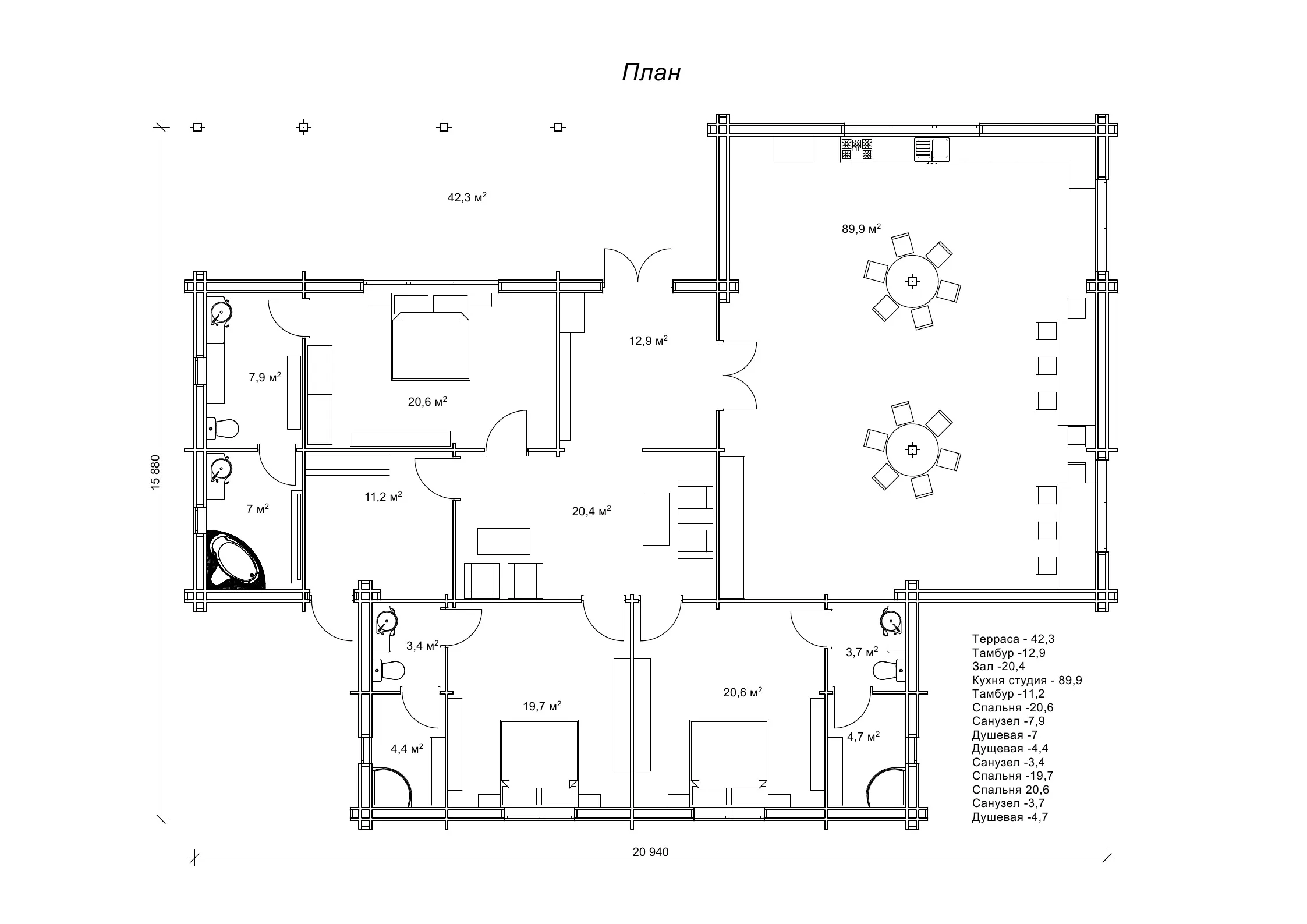«Дамейя» має розмір 15,8 × 20,9 м, у ній виділено зал на 20,4 м2 для спілкування, а також простору кухню-студію на 89,9 м2, де гості можуть одночасно сісти за стіл, приготувати собі їжу або просто випити кави, і там вистачає місця всім без винятку. Біля входу велика тераса. Її площа 42,3 м2. На ній легко зробити лаунж, бар або зону з лежаками біля вуличного басейну. Як бачите ми здатні побалувати вас проектами будівель будь-якої складності і призначення: від гостьового будиночку до готелю! Ще більше гідних уваги проектів будинків з утепленням дивіться в нашому загальному каталозі. На кожній сторінці з проектом ми підготували вам докладну інформацію про план з розмірами, комплектацію, фото робіт та інші деталі будинку. Обираючи житло з подвійного брусу з утепленням, ви інвестуєте не лише у квадратні метри, а й у комфорт та здоровий мікроклімат. Зробіть свій вибір на користь енергоефективності та довговічності - і ваш дім залишатиметься надійним і затишним поколіннями!