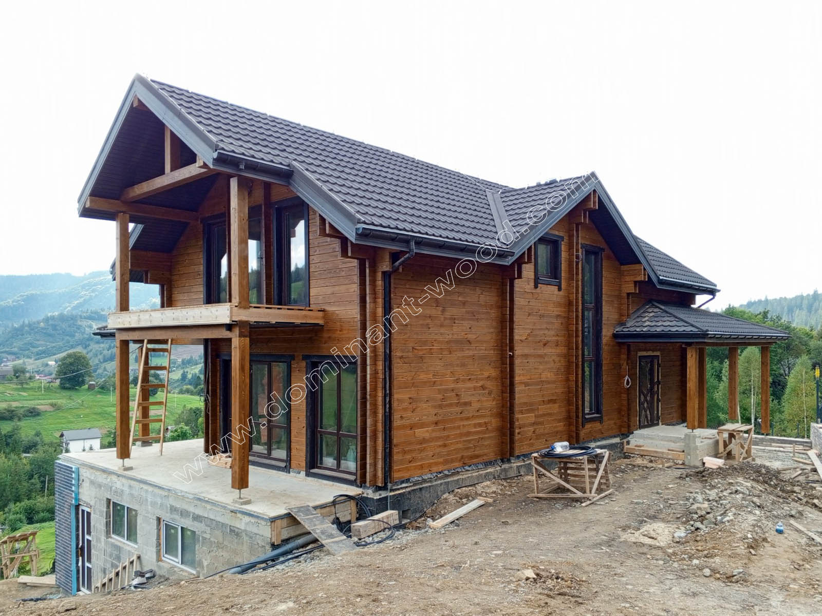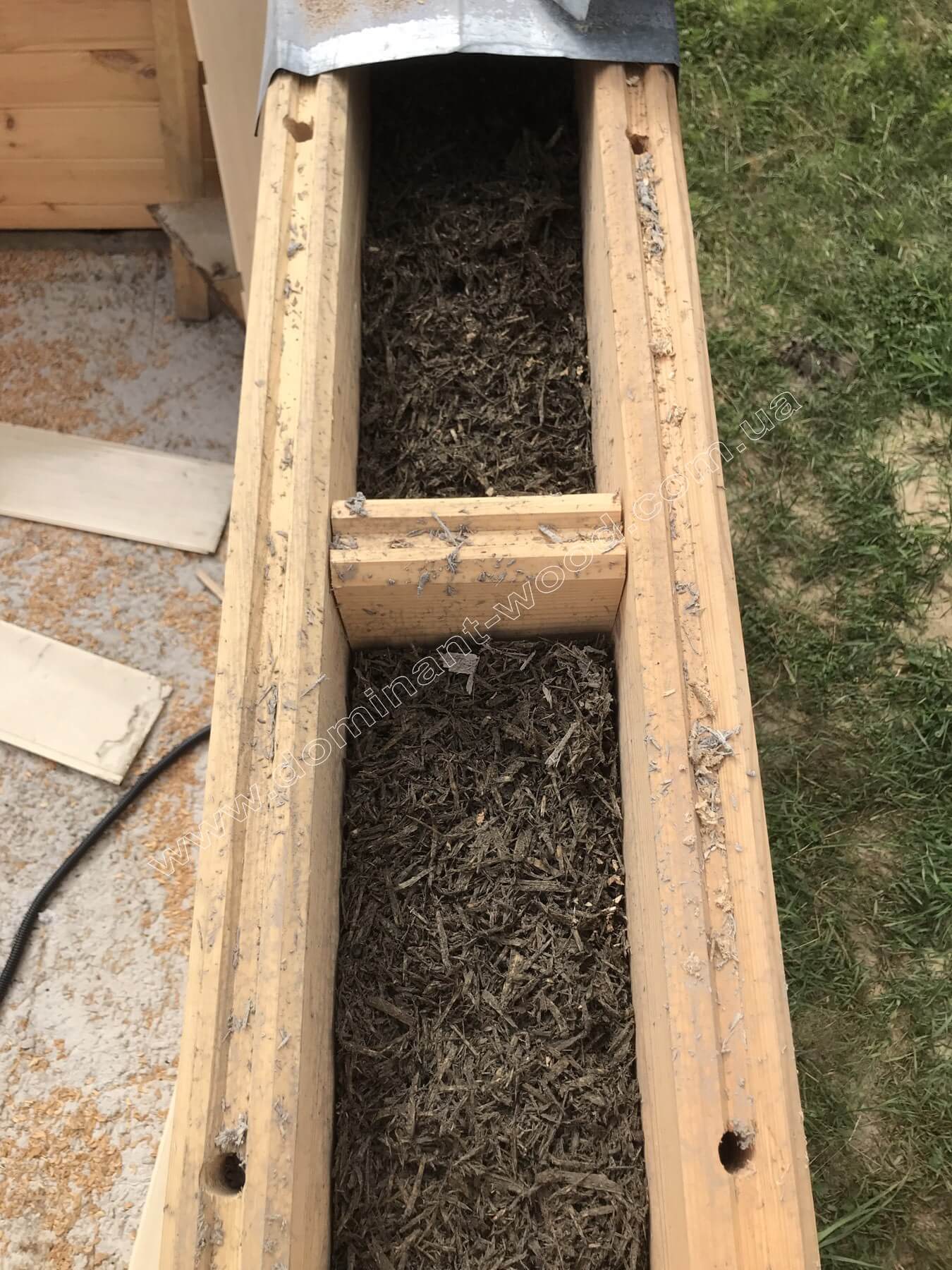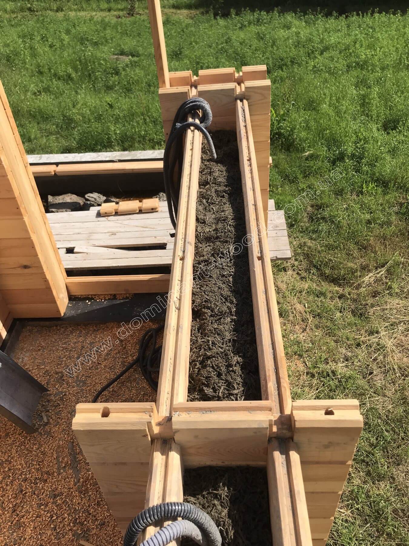 Раніше для будівництва своїх проектів компанія «Домінант» використовувала утеплювач URSA (Pure One) товщиною 150 мм. Це безпечний для людини, екологічно чистий матеріал з високими теплоізоляційними властивостями, який не підтримує горіння. Сьогодні ми вдосконалили технологію подвійного брусу з утепленням і перейшли на арболіт (деревобетон). Він складається з органічного наповнювача (тирса) та цементу. На нашому виробництві арболіт готується з соснової тирси (ми працюємо виключно з сосною) та цементу марки 400 або 500. У суміш додається вода і вапно. Вапно виконує важливу функцію: воно повністю нейтралізує глюкозу в деревних трісках, роблячи матеріал стійким і нецікавим для комах та гризунів. Добре приготований арболіт стає чудовим утеплювачем. Завдяки безлічі повітряних пор він бездоганно утримує тепло і не дає усадки. Це матеріал, безпечний для людини, екологічно чистий, не схильний до появи цвілі чи гнилі. Крім того, арболіт відрізняється низькою горючістю - він не підтримує поширення вогню. І як дерево, цей матеріал «дихає», завдяки чому в будинку зберігається природний і здоровий мікроклімат.