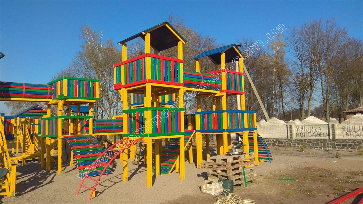 Активне проведення часу дітвори на свіжому повітрі зміцнює імунітет і надає більше сил краще вчитися. Як зробити так, щоб діти більше рухалися і були на вулиці, запитаєте ви? Відповідаємо - побудувати дитячий будиночок у дворі і обладнати навколо нього ігровий майданчик. Наприклад, влаштувати гірку, встановити турніки і гойдалки. Дітвора зможе гратися і займатися спортом одночасно. Докладні рекомендації з будівництва і оснащення майданчика для дітей пропонуються в одній з публікацій на сайті. Зараз ми просто хочемо показати приклади створення дитячих майданчиків і великих ігрових комплексів для дітей, щоб ви побачили, як ми будуємо ігрові майданчики з гірками і турніками з дерев'яного бруса. Компанія «Домінант» пропонує забудову заміської ділянки в комплексі. Замовляючи у нас будівництво дерев'яного котеджу, можна заодно придати дитячий ігровий будиночок з ігровим майданчиком. Ігровий майданчик, виконаний з дерев'яних елементів і привабливо оформлений всіма кольорами веселки, допоможе розвинути силу рук і ніг, спритність і впевненість, стане чудовим місцем для відпочинку і розвитку ваших дітей!