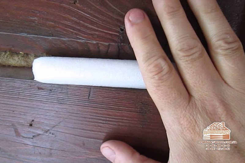 4. Після технологічної сушки шнур зі спіненого поліетилену укладають в шовний простір за допомогою конопатки з гумовим наконечником. У винятковому випадку шнур можна приклеїти за допомогою того ж герметика RAMSAUER 160 Acryl, наносячи на підставу кілька крапель герметика з кроком 50 см. При цьому шнур повинен бути стиснутий приблизно на 25% для більш надійної фіксації. Розмір шнура повинен відповідати ширині шва. Шнур потрібен для того, щоб герметик не контактував з міжвінцевим утеплювачем (в нашому випадку це синтепон). У акрилового герметика немає адгезії до спіненого поліетилену, тому при експлуатації герметик буде стискатися і розтягуватися тільки між дерев'яною поверхнею.