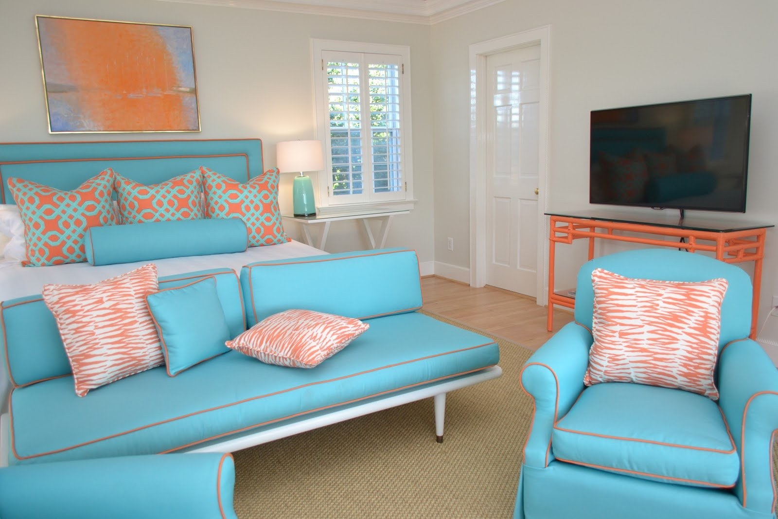 Персик та блакитний. Комбінація, що викликає спокій і освіжає будь яке приміщення. Сині акценти (подушки, килими) на персиковому фоні створюють дуже цікавий акцент в інтер’єрі. Перевірений спосіб сполучення кольорів у дизайні – це спеціальне коло Іттена, в якому 12 кольорів розташовані у порядку відтінків природного спектру. Відтінки, які знаходяться протилежно персиковим в колі Іттена - це сині. Таке поєднання кольорів створює контраст та гармонію одночасно, оскільки ці кольори є доповнюючими один одного. Комбінація теплого персикового кольору з холодним синім або блакитним завжди виглядає ефектно. Наприклад, персикові стіни або панно з декором в поєднанні з меблями у синьо-зелених відтінках можуть створити елегантний інтер'єр з вишуканим контрастом.