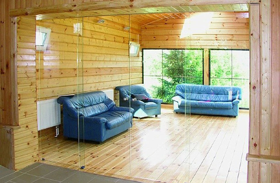 Напрочуд гарним є поєднання дерева і скла в інтер’єрі зрубу. Тому такі конструкції затребувані в офісах або готелях, ресторанах або кафе. Вдома також можна поєднати скло і дерево для створення оригінального і сучасного дизайну. Монтаж скляної перегородки вимагає застосування спеціального профілю, інструментів і знань, тому встановлення таких конструкцій вимагає професійного підходу.