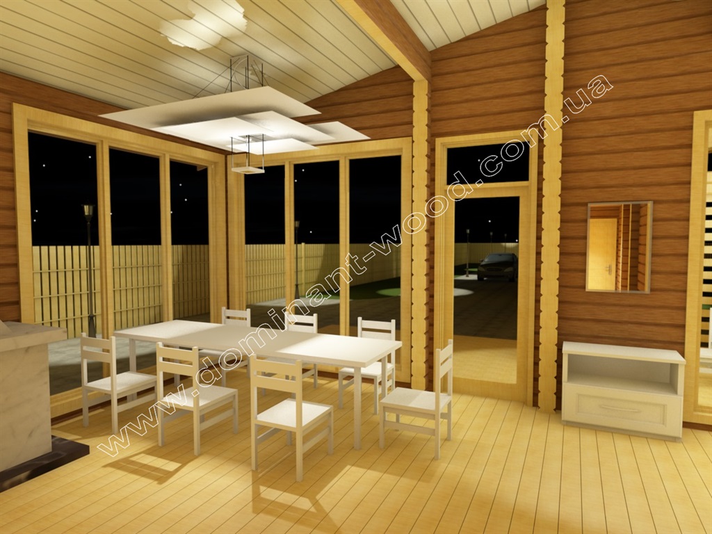 Новизна і витонченість абсолютно відрізняє проект «Давер» від традиційного оциліндрованого зрубу. Поглиблена всередину будівлі тераса з дерев'яними декорами, скати даху на різних рівнях додають вишуканої краси та оригінальності проекту «Давер».