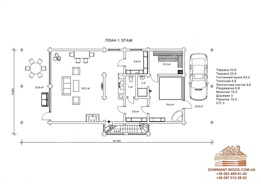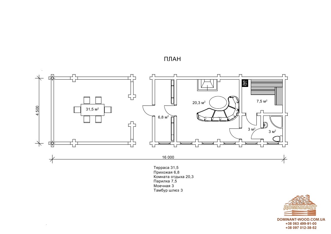 Першим, звичайно ж представляємо проект лазні "Континент2" , про який ми, схоже, найчастіше згадуємо через його стійку популярністю серед клієнтів. Це будинок-баня, загальною площею 51м2. Складається з оциліндрованого бруса, діаметр необхідного колоди, ви обираєте самостійно. Для лазні рекомендується діаметр 180 мм, такої товщини дерев’яних стін буде досить для прекрасного проведення часу в лазні. Особливістю даного проекту є його дизайн. Практичний і молодіжний стиль хай-тек, однозначно приверне увагу ваших клієнтів. Внутрішнє планування складається з парилки з помивочною, кухні-студії і кімнати для відпочинку. Цього приміщень досить для організації повноцінного відпочинку ваших гостей. У парильні для затишку можна розвісити пучки ароматних трав або лампу з аромо-маслами, що посприяє максимальному розслабленню. Далі помивочна, тут бочки з холодною водою або міні-басейн. У кімнаті відпочинку ви можете влаштувати масажний кабінет або аромо-кімнату з легкою заспокійливою музикою. Ваші гості зможуть очистити не лише тіло, а й думки. На кухні, після всіх процедур, гостям можна запропонувати випити запашного чаю, є ті, хто після лазні любить поїсти, можна ввести послугу з приготування і доставки їжі (заздалегідь обумовлюється з гостями). Як би ви не розподілили функціональність і дизайн кімнат в проекті "Контінент2", ми впевнені, що ваші гості залишаться задоволені і прийдуть ще багато разів.