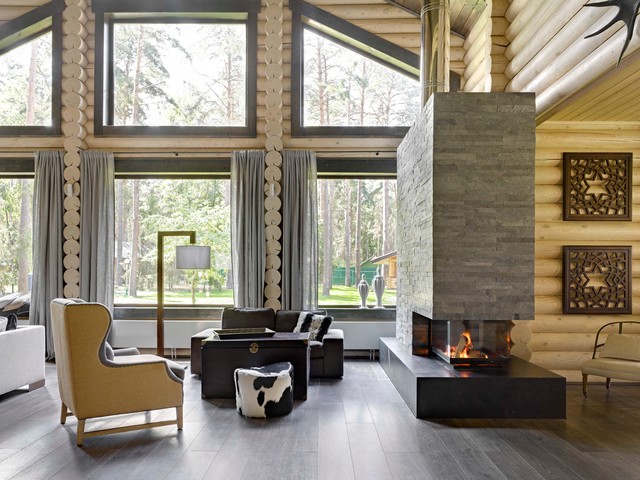 Звичайно, у разі недостатнього освітлення, можна додати точкових світильників, але природне освітлення все ж набагато важливіше, та й економніше штучного. Панорамне вікно — відмінне рішення для стильного, дерев'яного котеджу. Інтер'єр заграє новими фарбами, а вам не потрібно буде додавати штучні джерела освітлення. При цьому врахуйте поради по розташуванню вікон в будинку, які ми підготували в публікації «Як розташувати вікна в будинку?».