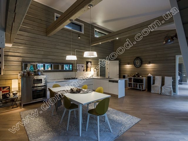 Останнім часом для стилізації дерев'яного будинку часто вибирають сучасні стилі типу хай-тек або лофт. В даному випадку важливо, щоб зовнішній вигляд будівлі відповідав внутрішньому наповненню. Наприклад, такі елементи інтер'єру хай-тек, як нестандартна геометрія меблів, абстрактна інсталяція, дзеркальна шафа на всю висоту приміщення підійдуть для маєтку з сухого брусу в стилі хай-тек 11х16,3 м на два поверхи - «Дафред». На цій віллі цілком гармонійно виглядатиме фантазійний інтер'єр в стилі футуристичного дизайну міжзоряного корабля. Багато хто думає, що промислово-урбаністичний лофт ніяк не поєднується з м'якістю дерев'яних зрубів. Але тільки подивіться на наш проект вілли «Стейнмун» з невеликими прямокутними віконцями, односхилими дахами в стилі міських будівель. Тут можна створити незвичайний інтер'єр на основі індустріальних елементів дизайну. Такий стиль полюбляють люди творчих професій, на просторих площах вілли «Стейнмун» з легкістю можна облаштувати майстерню з виставковим залом, втіливши в життя найсміливіші ідеї в життя.