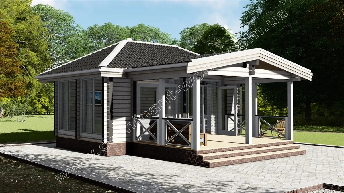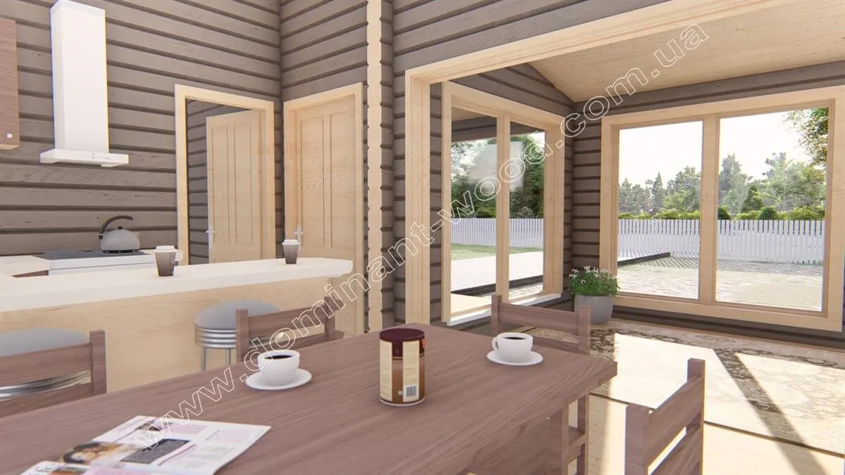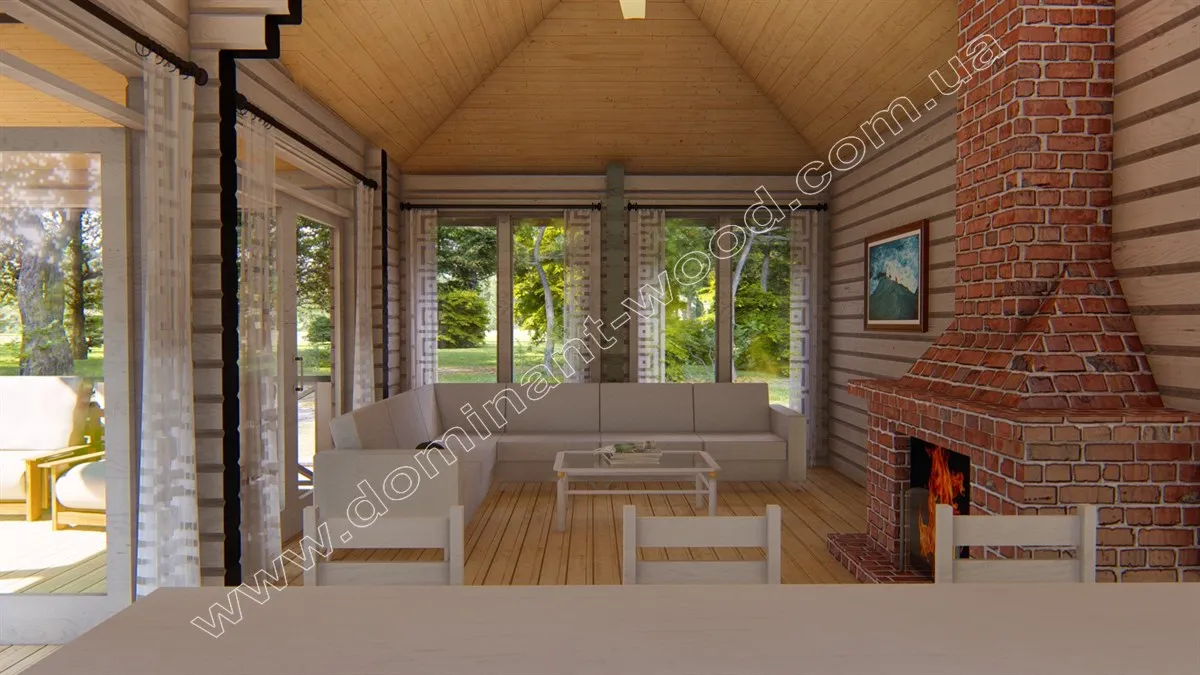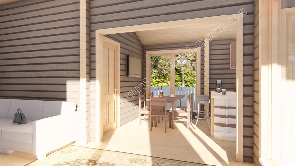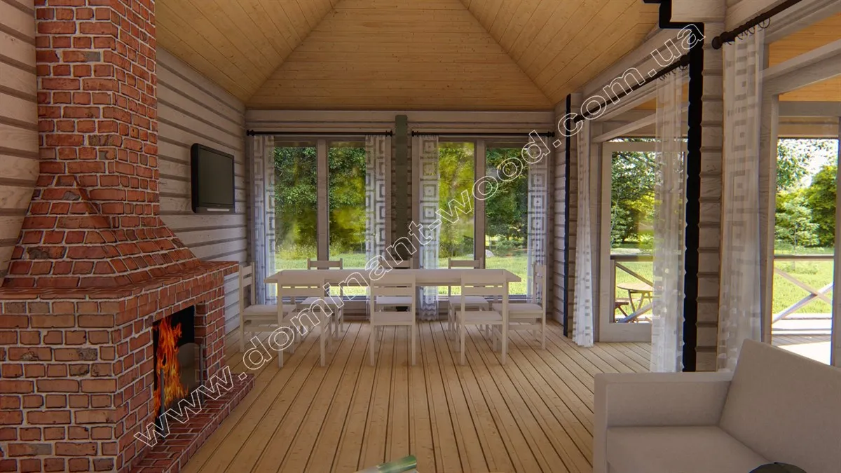 Камінна зала з літньою терасою стане надбанням будь-якого відпочинкового комплексу. Проект «Бертіна» є дуже привабливою будовою, оснащеною великими вікнами і відкритим навісом. Цей затишний будиночок створений із сухого, профільованого бруса, що робить його ідеальним доповненням до присадибної території чи заміського відпочинку. «Бертіна» може служити як закрита зимова альтанка з каміном, так і літня тераса. Поєднання мальовничого дизайну та високоякісних матеріалів робить цей проект привабливим вибором для тих, хто прагне наповнювати простір виключно натуральними матеріалами. Атмосферний павільйон «Бертіна» створює приємну, природну обстановку, наповнюючи повітря свіжістю та приємним ароматом. Це ідеальне місце для гостей, щоб розслабитися, відпочити та заповнити свої сили у спокійній обстановці.