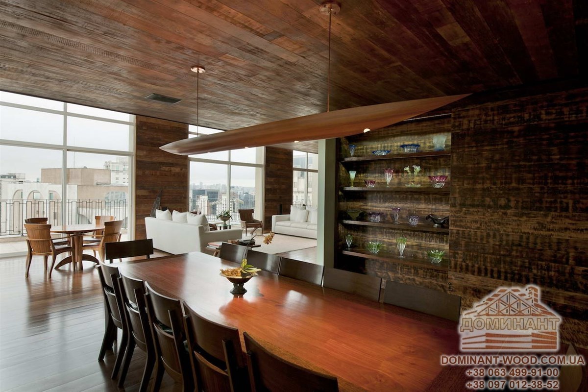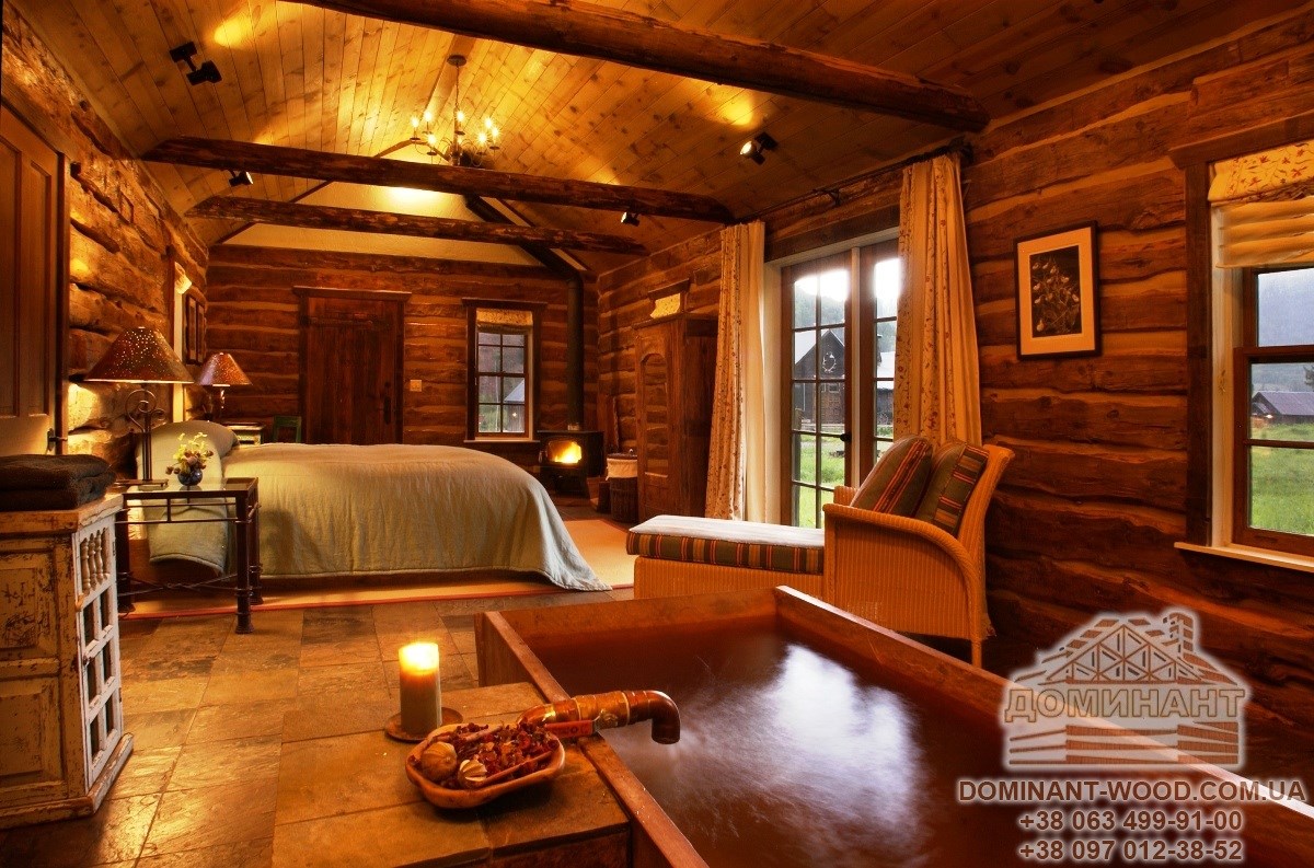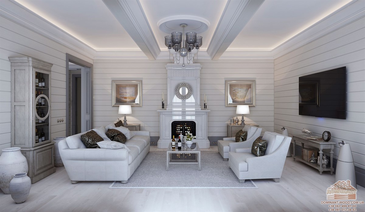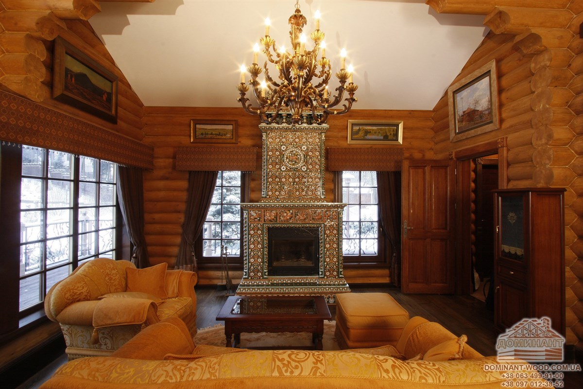 Це найпоширеніший спосіб поєднання студійного простору в заміському будинку з бруса. Мало хто уявляє собі дерев’яний будинок без каміна. У великій, просторій вітальні біля каміна добре буде поставити м’який куточок, де так зручно відпочивати, спостерігаючи за мальовничими язиками полум’я. Крім того, тут буде відчуватися тепло і можна буде зігрітися, коли за вікном падає сніг або ллє дощ. Можна постелити перед каміном пухнастий, хутровий килим, який допоможе розташуватися прямо біля каміна на підлозі. Вибрати відповідний камін в дерев’яний зруб і зробити його енергоефективним вам допоможе одна наша дуже корисна стаття «Як в дерев’яний будинок вибрати камін і зробити його максимально ефективним?»