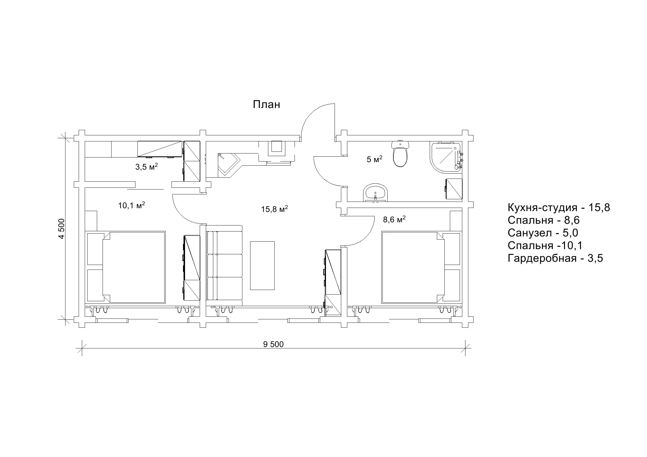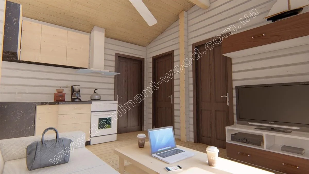 Загальна площа будинку складає 67,23 м2, включаючи дві просторі спальні, кухню-студію та санвузол. Кожен мешканець отримає свій власний затишний куточок, де можна насолоджуватися спокоєм та затишком. Цей стильний та привабливий одноповерховий котедж створений, щоб бути ідеальним місцем для відпочинку на природі. Замовивши будівництво проекту «Діната», ви отримаєте якісний та комфортний зруб з оциліндрованих, соснових колод, який завдяки своїй чудодійній хвойній свіжості подбає про настрій, внутрішній стан і здоров’я мешканців.