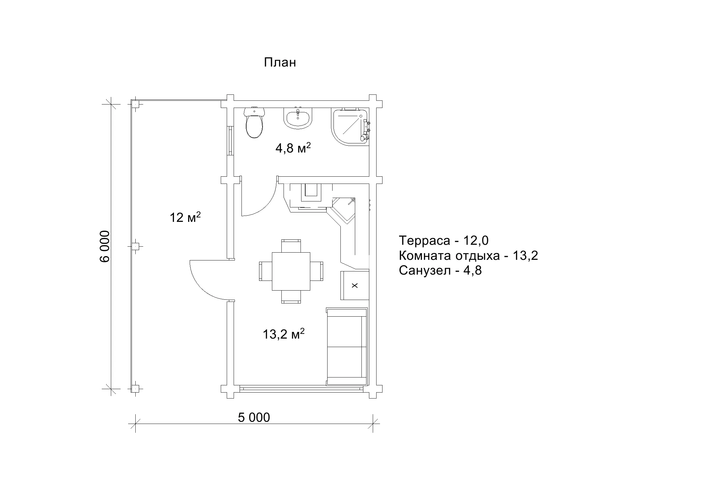 Це прекрасне місце для дозвілля або медитації на свіжому повітрі. Усередині будинку є одна кімната площею 13,2 м2 і санвузол площею 4,8 м2. Такий план ідеально підійде для тих, хто прагне сам на сам відновити душевний стан та пізнати себе. Проект «Басса» стане прибутковим комерційним об'єктом - чи то буде гостьовий будиночок для ретриту, кемпінгу, бази відпочинку, офіс або навіть магазинчик. Окрім максимально простого та зручного планування, котедж «Басса» привертає увагу більшості клієнтів своїм цікавим і сучасним виглядом.