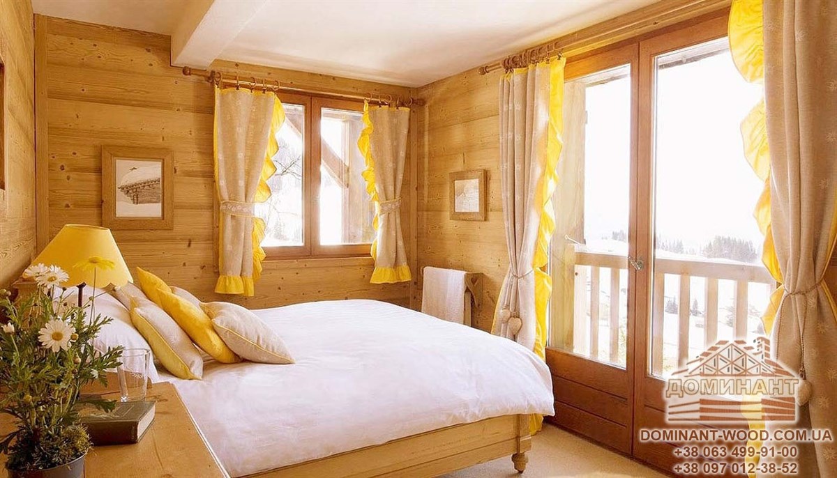 Декор вікон і меблів в дерев’яному будинку ви підбираєте на свій смак, і кращий вибір при цьому - натуральна тканина. Портьєри, тюль, римські штори. Безліч вікон дає волю вашій фантазії. Як правило натуральні тканини всі пофарбовані в м’які відтінки. Грамотний вибір фіранок і штор допоможе не тільки прикрасити будинок, але і додати в нього світла і простору. При виборі меблевої оббивки, ви навпаки можете зіграти на контрасті, і підібрати кілька яскравих деталей. Наприклад, подушки на диван або стільці.