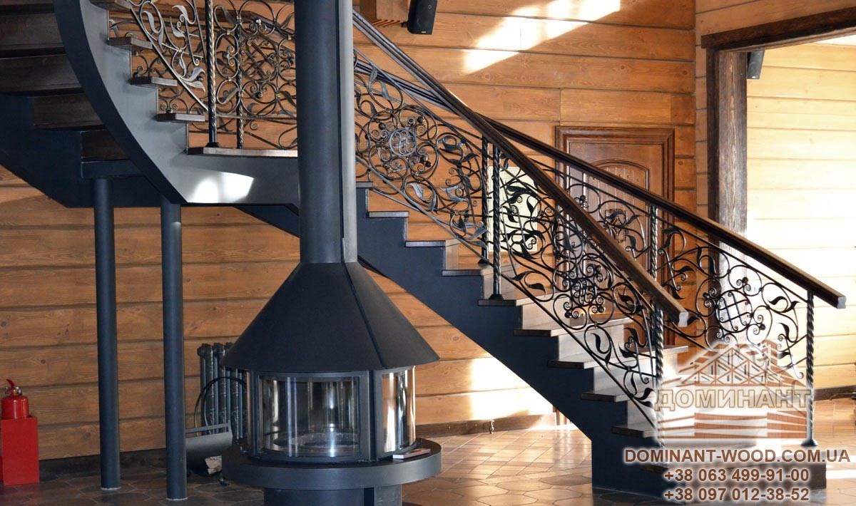 Як правило сходи в дерев’яному будинку масивні і теж повністю складаються з дерева. Ми ж хочемо запропонувати з’єднати дерево зі склом або куванням. Все залежить від того, який стиль інтер’єру ви вибрали - класичний або сучасний. Для класики характерна ковка, для сучасного інтер’єру - скло. Можна зробити скляні перила, вони будуть візуально полегшувати масивні сходи. Можна зробити навіть підвісні ступені- прибираємо перила, а ступені між собою не з’єднуються. Вони вбудовуються в стіну, за спеціальною технологією.