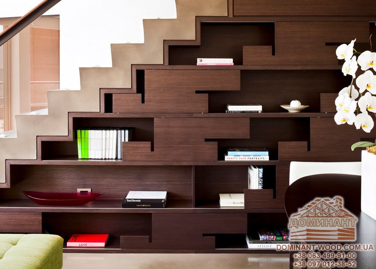 Над сходами, в стіні, можна зробити стелажі і поставити на них книги, або виставити свої кубки та нагороди (якщо ви спортсмен), можете влаштувати невеликий квітник (поставити по стелажах горщики з кімнатними рослинами).