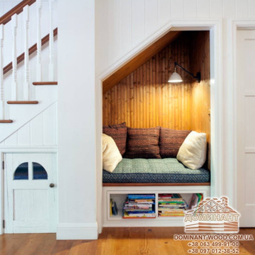 Можна вигідно використовувати простір під сходами. Наприклад влаштувати там оригінальний будиночок для дітей або невеликий винний льох для себе.