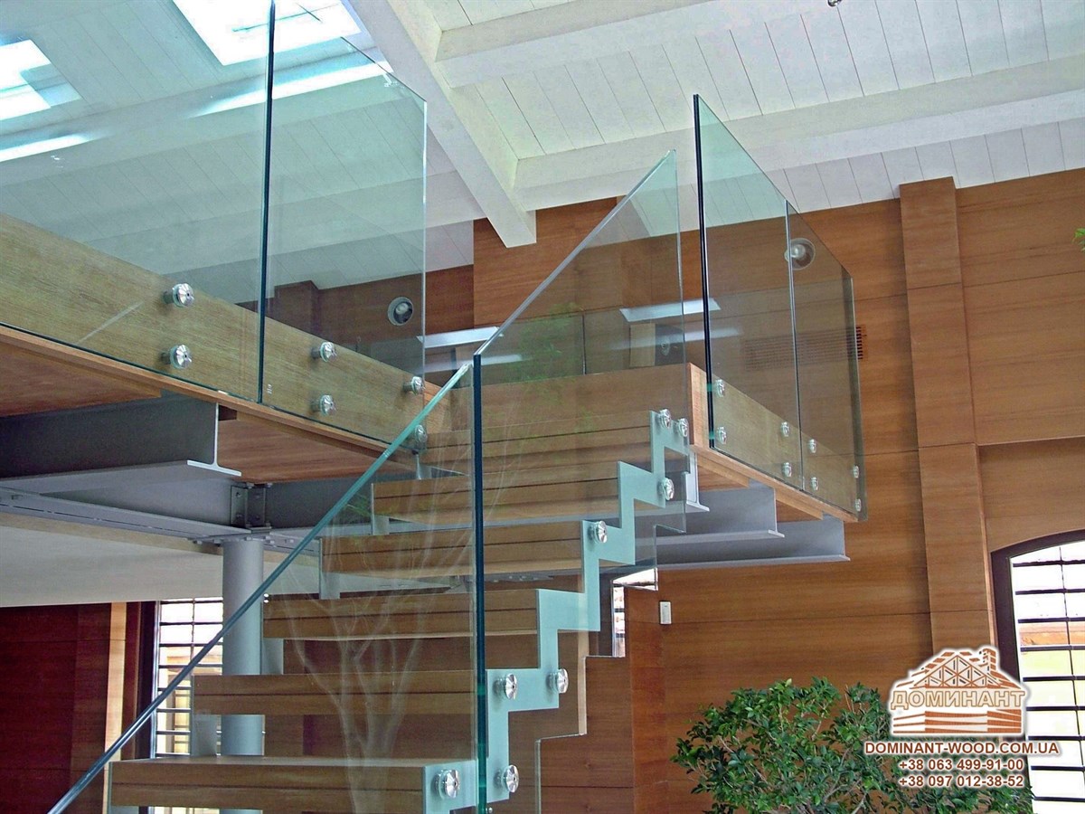 Скляні сходи являють собою повітряну, майже невидиму конструкцію, в якій і сходинки, і підсходинки, і поручні виготовлені з багатошарового скла, з'єднаного спеціальними плівками, що повністю виключає крихкість конструкції. Основа і з'єднувальні елементи для сходів зі скла виготовляються з металевого профілю.