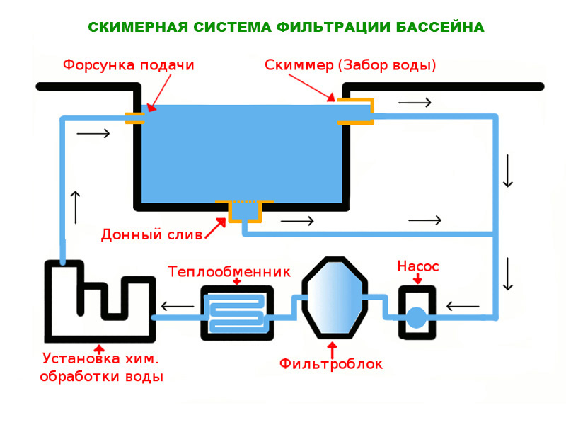 Скіммерний тип очищення має на увазі, що вода йде в отвори з фільтрами на бортах басейну, і надходить назад вже очищеною. При цьому, рівень води завжди на 10-20 см нижче рівня бортика.
