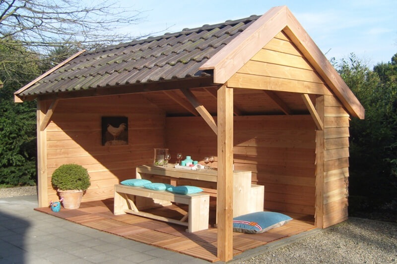 Дерев'яна вагонка або блокхаус. Профільні вироби з дерева взагалі виступають універсальним рішенням для облицювання стін, каркасів та інших перегородок. Наприклад, вагонкою можна обшити альтанку по бортах. Або частину альтанки закрити вагонкою до бортиків, а одну стіну повністю зашити, щоб в альтанці можна було проводити час навіть у вітряну погоду. Вагонка завжди монтується на дерев'яний каркас, для чого в навісі потрібно встановити вертикальні стійки і закріпити перила.