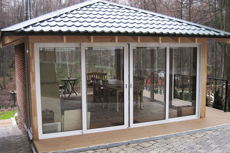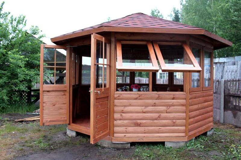 Скляні вікна. Це особливо поширене рішення для альтанки або садового павільйону. Такі конструкції спочатку роблять напіввідкритими, зашиваючи бортики, але верхня частина по периметру залишається продуваємою. Якраз для верхньої частини будівлі можна передбачити можливість монтажу вікон. Ці вікна, як правило, знімні. На зиму, або просто в холодну погоду вікнами закривають альтанку, а на літо їх знімають, щоб доступу до природи і свіжого повітря було якомога більше. До речі, задумуючи будівництво альтанку, можна визначально вибирати закритий, засклений варіант. Готові проекти закритих бесідок пропонуються в каталозі дерев'яних будівель «Домінант».