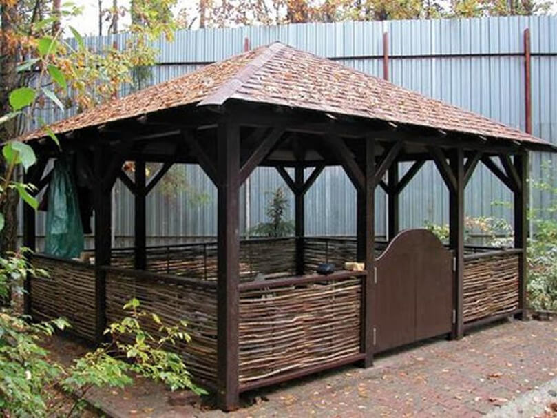 Очерет або лоза. Оригінальний вибір, який зустрічається не так вже й часто. Але немає кращого способу закрити альтанку від вітру, при цьому зберігаючи приплив свіжого повітря. Як правило очерет або лоза використовуються в панелях, іноді їх роблять у вигляді ширми або з підйомним механізмом. До речі саме очеретяна огорожа буде дуже гармонійно поєднуватися з живоплотом. Очеретяні панелі або огорожу з плетеної лози дуже легко і швидко встановити. Для такого огородження вам не знадобиться спеціальних інструментів і навичок, як, наприклад, при обшивці вагонкою або полікарбонатом. Очерет або лоза естетично і легко захистить будь-яку ділянку від вітру і порадують своїм зовнішнім виглядом.