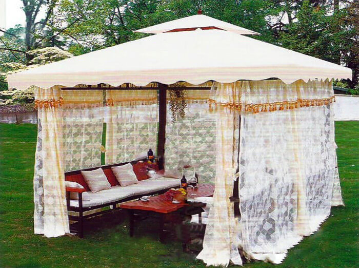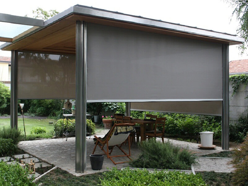 Сонцезахисна тканина. Один з найбільш якісних способів захистити терасу або навіс не тільки від дощу й вітру, але і від сонця або навіть в деяких випадках морозу (наприклад, морозостійкий акриловий текстиль). Акрилові штори витримають контраст температури від -25°С до 60°С, при цьому відмінно утримуючи тепло всередині приміщення. Щільність акрилового текстилю 280 г/м2, а текстура несприйнятлива до впливу вологості або механічних пошкоджень. До переваг акрилового матеріалу також віднесемо легкість його чистки, великий вибір колірних рішень для створення будь-якого дизайну. Світлонепроникність і герметичність цього матеріалу надійно захистить відкритий павільйон навіть в зимову пору. Але зберігаються такі штори тільки в рулоні, тому що в зігнутому вигляді тканина може протиратися і псуватися.