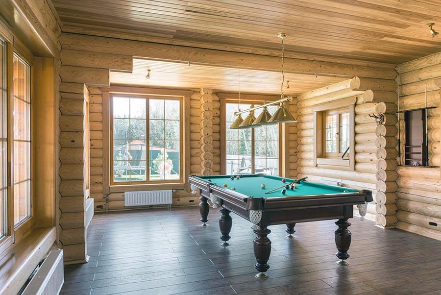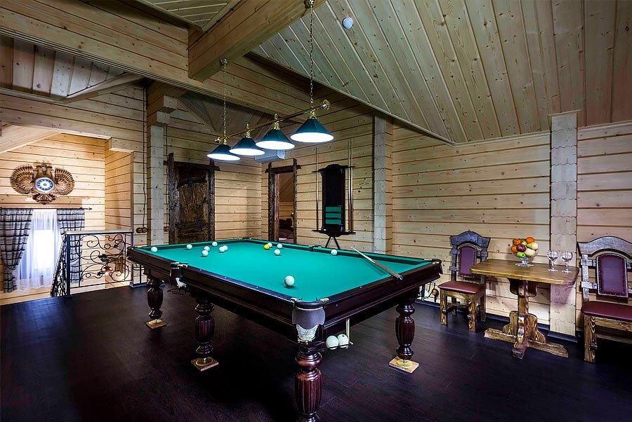 Більярдну кімнату рідко зустрінеш в будинку. Чого варто придбати один стіл під зеленим сукном і необхідні ігрові атрибути. Специфіка більярдної визначає вимоги до інтер'єру не тільки самого приміщення з більярдом, а й до аристократичного стилю всієї будови. Але ми ж з вами розглядаємо кімнати будинку для душі. Якщо хазяїн споруди - азартний гравець в більярд, та ще й володіє у своєму розпорядженні достатніми фінансами, то чому б не зробити собі таку віддушину вдома? При цьому з'являється постійний доступ до улюбленого і цілковито поглинаючого заняття. У будь-який момент можна буде взяти кий і зануритися в гру, забувши про метушню і стреси.