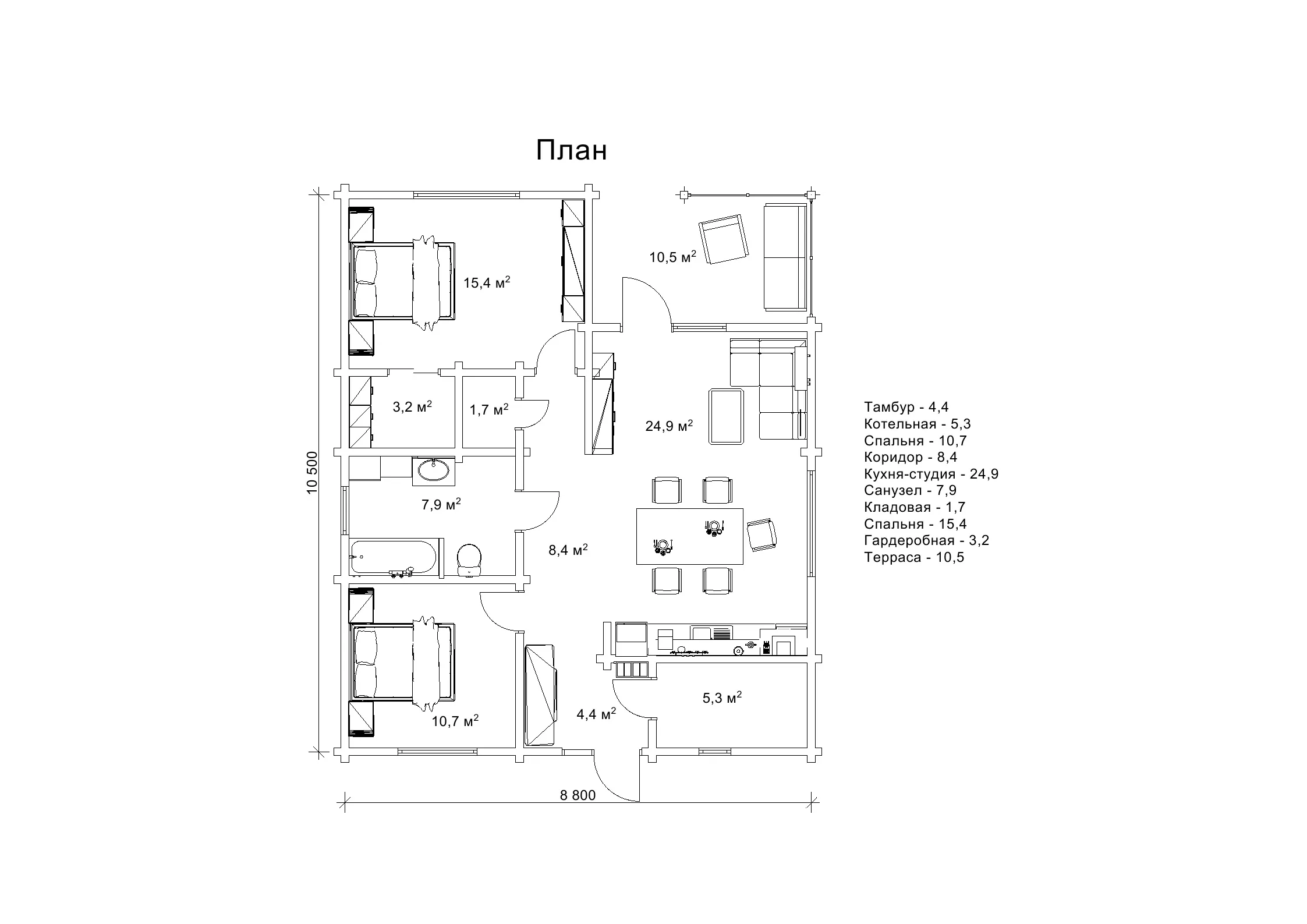Для того, щоб краще скласти враження про комфортний житловий план та типовий план для відпочинку порівняємо два проекти: «Навад» і «Мадж». «Навад» просто створений для комфортабельного життя. Його габарити - 10,5 × 8,8 м, і кожен метр тут використано з розумом. При вході - затишна тераса, де легко уявити собі ранкову каву або вечірні розмови. З неї одразу потрапляєш у простору кухню-студію - серце будинку, звідки відкривається доступ до двох окремих спалень і великої ванної кімнати. Поруч із ванною розміщена окрема комора - дрібниця, а наскільки зручно, коли є куди сховати все зайве. Є додатковий вхід, що веде через тамбур до приміщення котельні - ще одна практична деталь, яка додає комфорту в повсякденному житті. Важливо й те, що в цьому проекті знайшлося місце не тільки для житлових кімнат, а й для господарських, без яких побут перетворюється на хаос. Є де сховати сезонні речі, де зберігати консервацію, інструменти чи побутову техніку. Є простір, де зручно розкластися з верхнім одягом, а не звалювати все в кутку. Котельня винесена в окреме приміщення, тож будинок можна легко перевести на автономне опалення й бути незалежним від зовнішніх умов. Гардеробна - невелика, але саме там, де треба. Усе по місцях, нічого зайвого, і кожна зона - зі своїм призначенням. Це продуманий простір, у якому хочеться жити і відчувати, що тут усе під контролем.