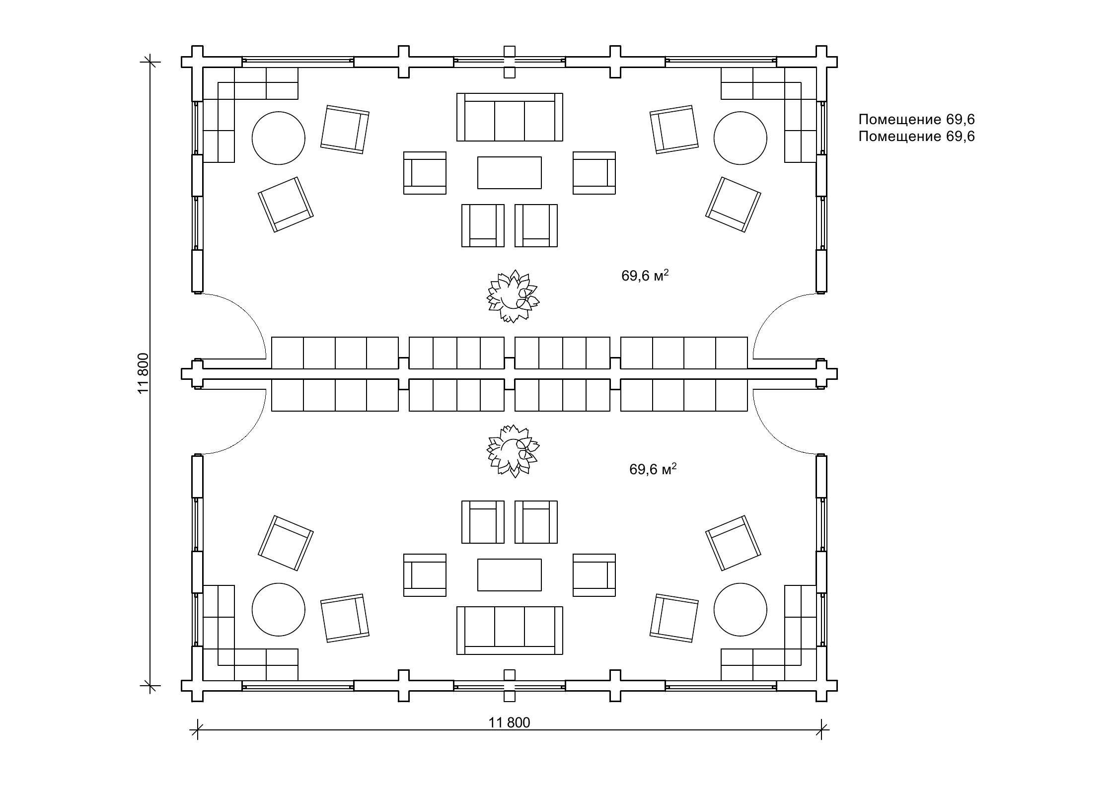 Планування павільйону з дерева на 2 зали, площа 139,2 м2