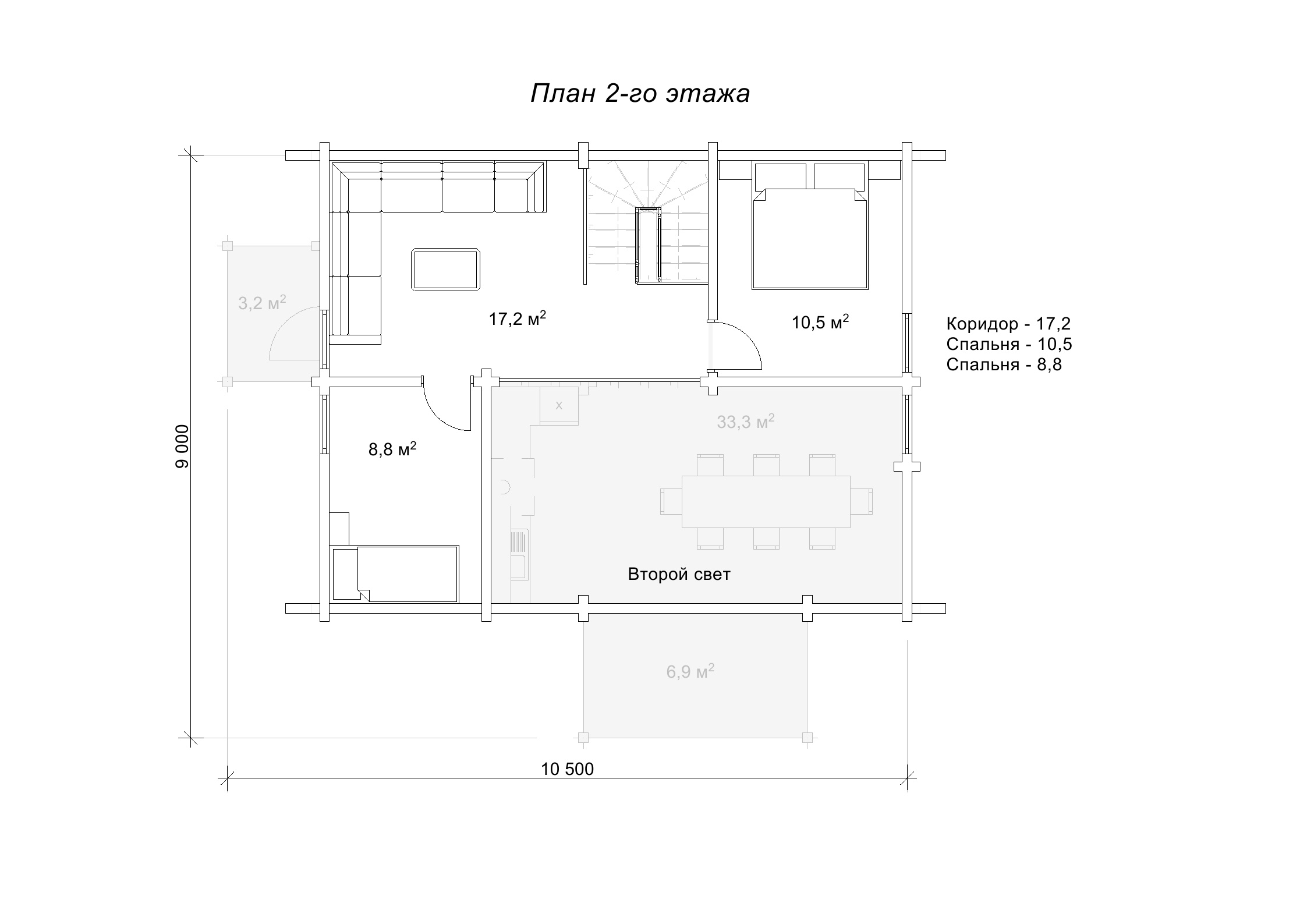 Планування маєтку «Донім» включає такі архітектурні прийоми, як «друге світло». Також примітно, що другий поверх розташовується в мансардному приміщенні, а це означає, що через вікна в покрівлі можна спостерігати небо з сонцем, що сходить, або нічними зірками. У проекті «Донім» дуже вдало поєднується максимальна практичність та естетика інтер’єру. У такому гарному будинку процес створення оригінального інтер’єру по-справжньому захоплює та дає можливість втілити усі свої мрії та бажання. Планування першого поверху садиби включає велику ванну кімнату, величезне студійне приміщення розміром 33 м2, де зонуються окремі функціональні підрозділи кухні, їдальні, вітальні. Також на першому поверсі розташоване досить просторе технічне приміщення, де можна зручно влаштувати кімнату для опалювального устаткування. Мансардний поверх у цьому проекті включає дві спальні кімнати та антресольний балкон, де можна помістити кабінет або бібліотеку. Ідея замовити будівництво будинку 9х10,5 м із сухого, профільованого бруса «Донім» у компанії «Домінант» стане найкращим вибором для комфортабельного життя за містом, сповненого затишком та високою естетикою!